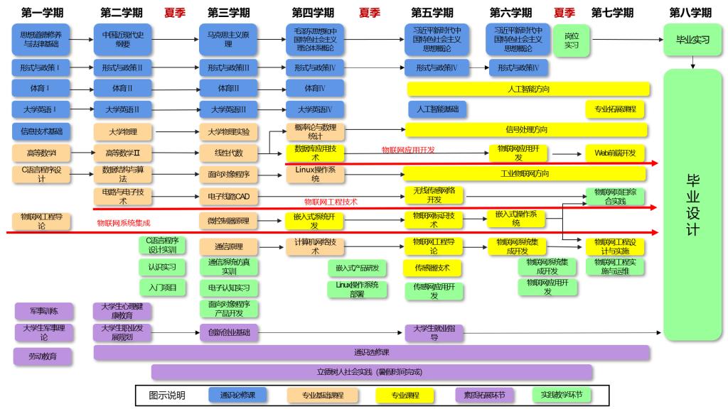 主干课程:电路与电子技术、微控制器原理、嵌入式操作系统、面向对象程序设计、计算机网络技术、通信原理、物联网工程导论、嵌入式系统开发、传感器技术、物联网标识技术、无线传感网络开发、物联网控制技术、物联网应用开发、物联网系统集成开发、物联网工程项目管理、物联网工程设计与实施。