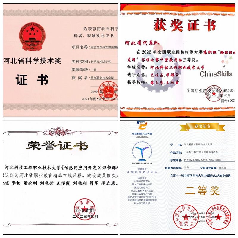 本专业在学校大力支持下,快速发展,近年来多次取得省级以上荣誉。曾荣获教师信息化教学大赛国家三等奖1项,省级教学成果奖三等奖1项,河北省科学技术进步奖三等奖1项。参与国家资源库项目建设1项,参与省级资源库项目建设1项,获评省级精品在线课程7门,全国大学生电子设计竞赛国家一等奖1项,国家二等奖1项,省级奖10余项,全国职业院校技能大赛物联网应用技术赛项国家三等奖1项,TRIZ创新方法大赛全国二等奖1项,三等奖2项,省级奖10余项。
