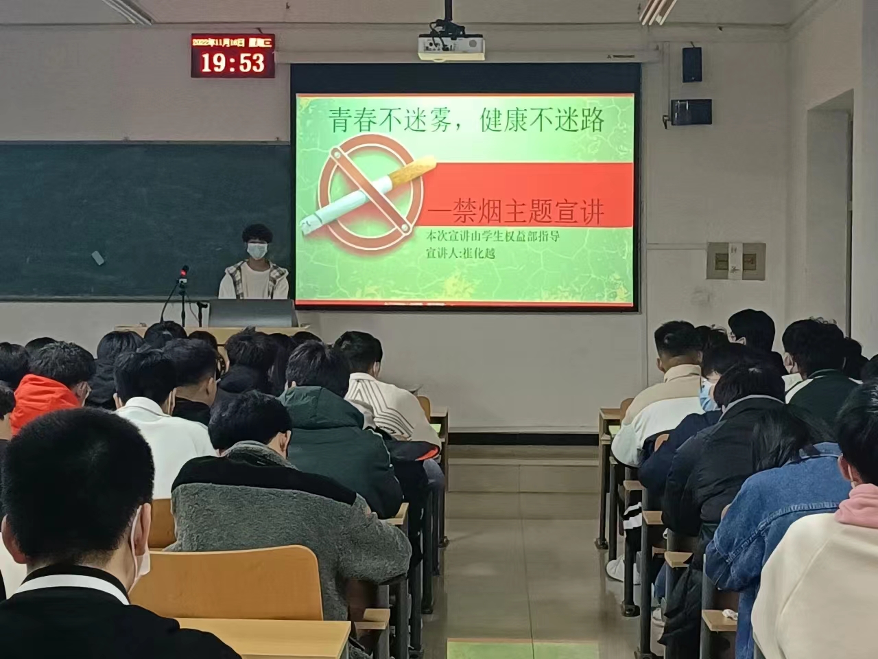 烟草之害,害人害己,禁烟控烟,拥抱健康。为积极开展无烟校园工作,创建健康的学习环境。电气工程系于11月16日晚在西校区C204开展了“青春不迷雾,健康不迷路"为主题的禁烟宣讲活动。