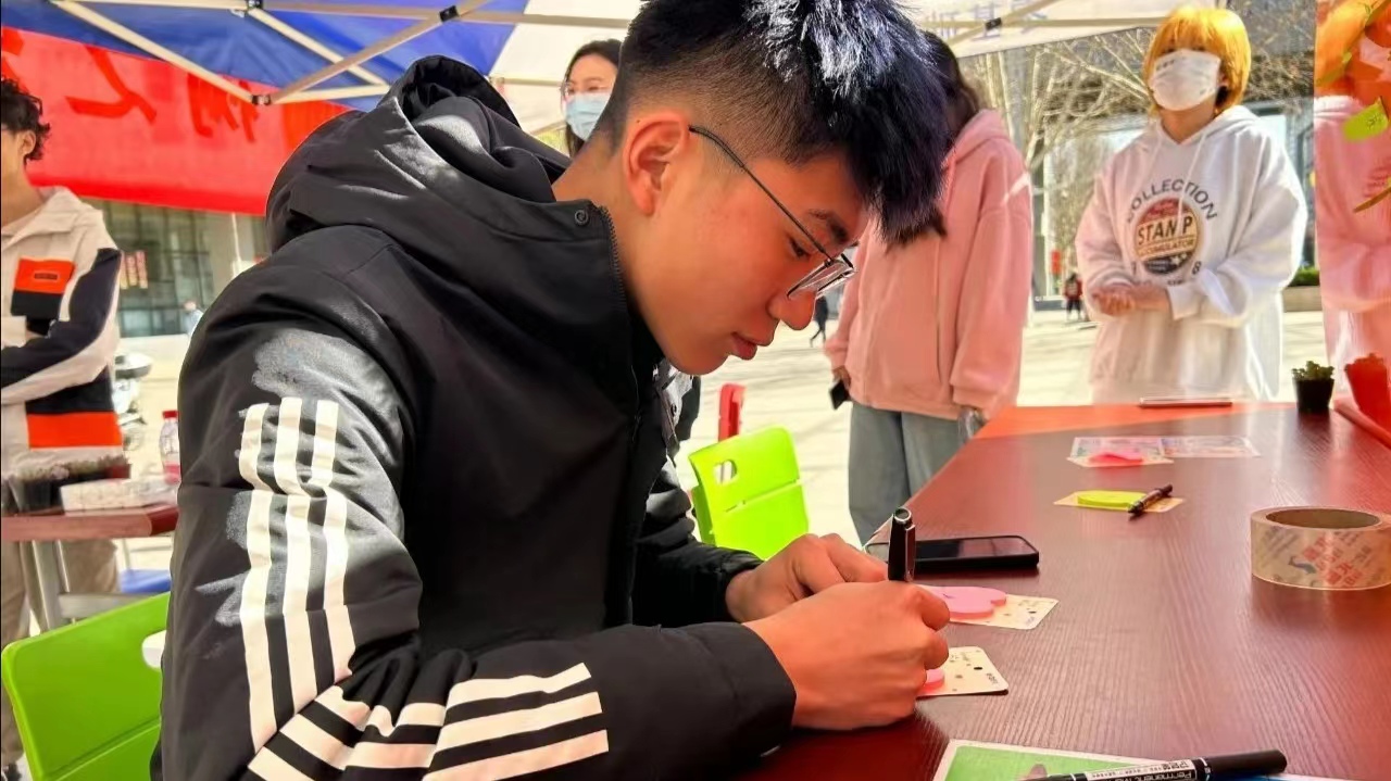 上午十点整,活动在浓烈的节日氛围中拉开帷幕,本次活动通过有奖竞猜环节可领取小绿植一盆,现场有集愿绿卡、有奖竞答、校内绿植实践养护等活动环节。有趣的活动形式吸引了我系同学的积极参加。同学们通过绿色心愿墙书写环保心愿卡,表达出心中对环保的期冀和对环境发展的美好祝愿。