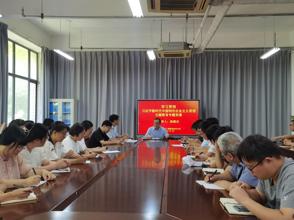 为扎实推进学习贯彻习近平新时代中国特色社会主义思想主题教育,切实把握“学思想、强党性、重实践、建新功”的总要求,做好理论学习工作,根据省委统一部署,按照学校《主题教育专题党课工作方案》安排,7月9日,校纪委书记赵建光到电气工程系和信息工程系以“持续推进党的自我革命”为题讲授主题教育专题党课。电气工程系和信息工程系教工党员、职工代表、学生党员到场聆听。