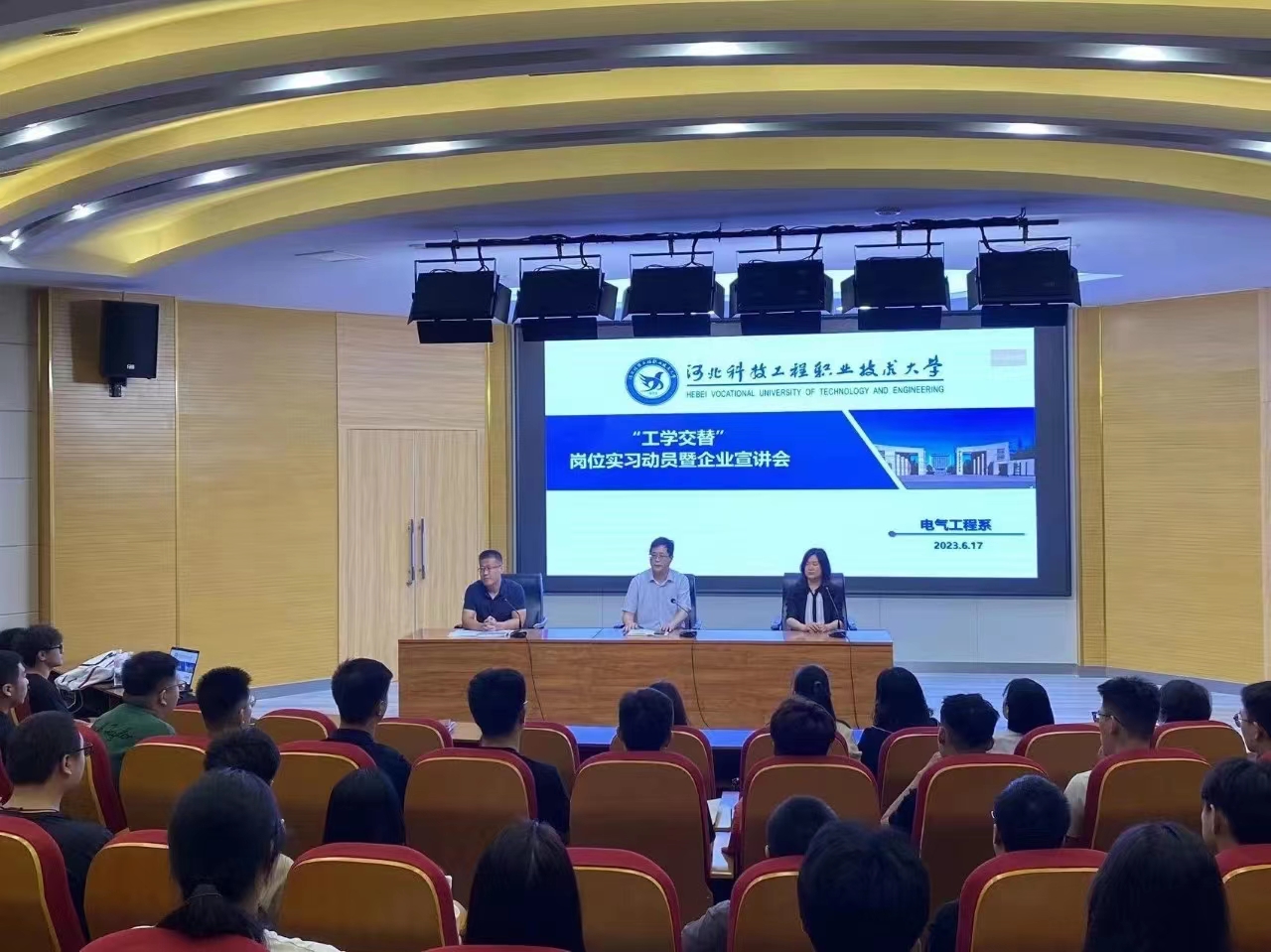 为落实立德树人根本任务,发挥工学交替实习在促进校企协同育人、学生全面发展方面的重要作用。电气工程系于2023年6月17日上午在学术报告厅开展了“工学交替”岗位实习动员暨企业宣讲会,电气工程系党总支书记艾立新、系主任陈丽、副主任毕艳军、全体指导教师、主管辅导员以及应用电子技术和通信技术专业学生参加会议。