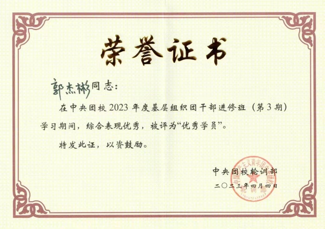 培训期间,郭杰彬老师认真参与、积极投入,表现优异,获评“优秀学员”,这生动展现了365官网团干部良好的职业素养和精神风貌。郭杰彬表示,此次培训使他在理想信念、初心使命、担当作为等方面接受了一次全方位的政治淬炼。