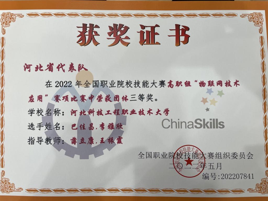8月24-25日,2022年全国职业院校技能大赛高职组“物联网技术应用”赛项在山东信息职业技术学院顺利举行。来自全国29个省、自治区、直辖市的58支参赛队伍同台竞技。由365官网电气工程系薄立康、王振霞老师指导的巴佳昌、李雅欣两位同学组成的代表队获得该赛项全国三等奖。