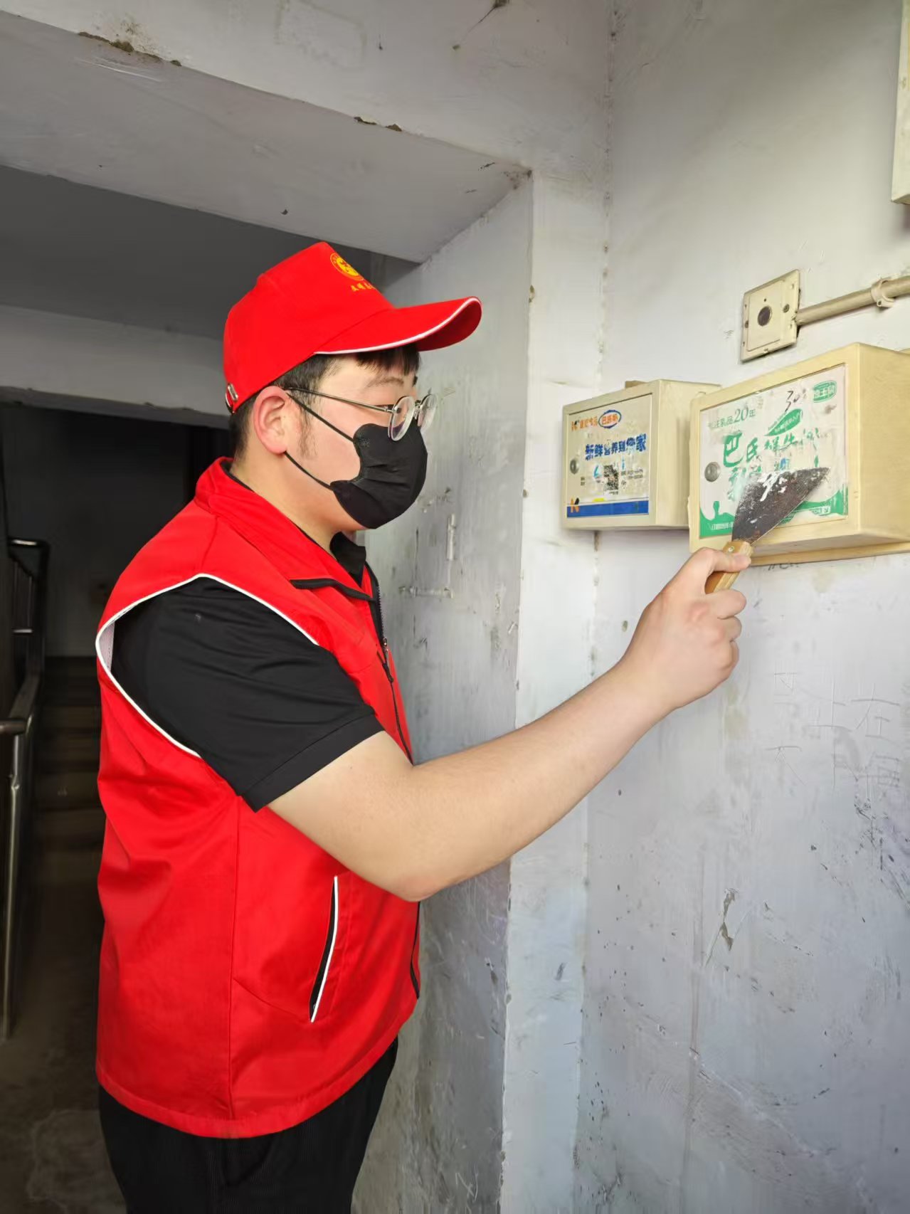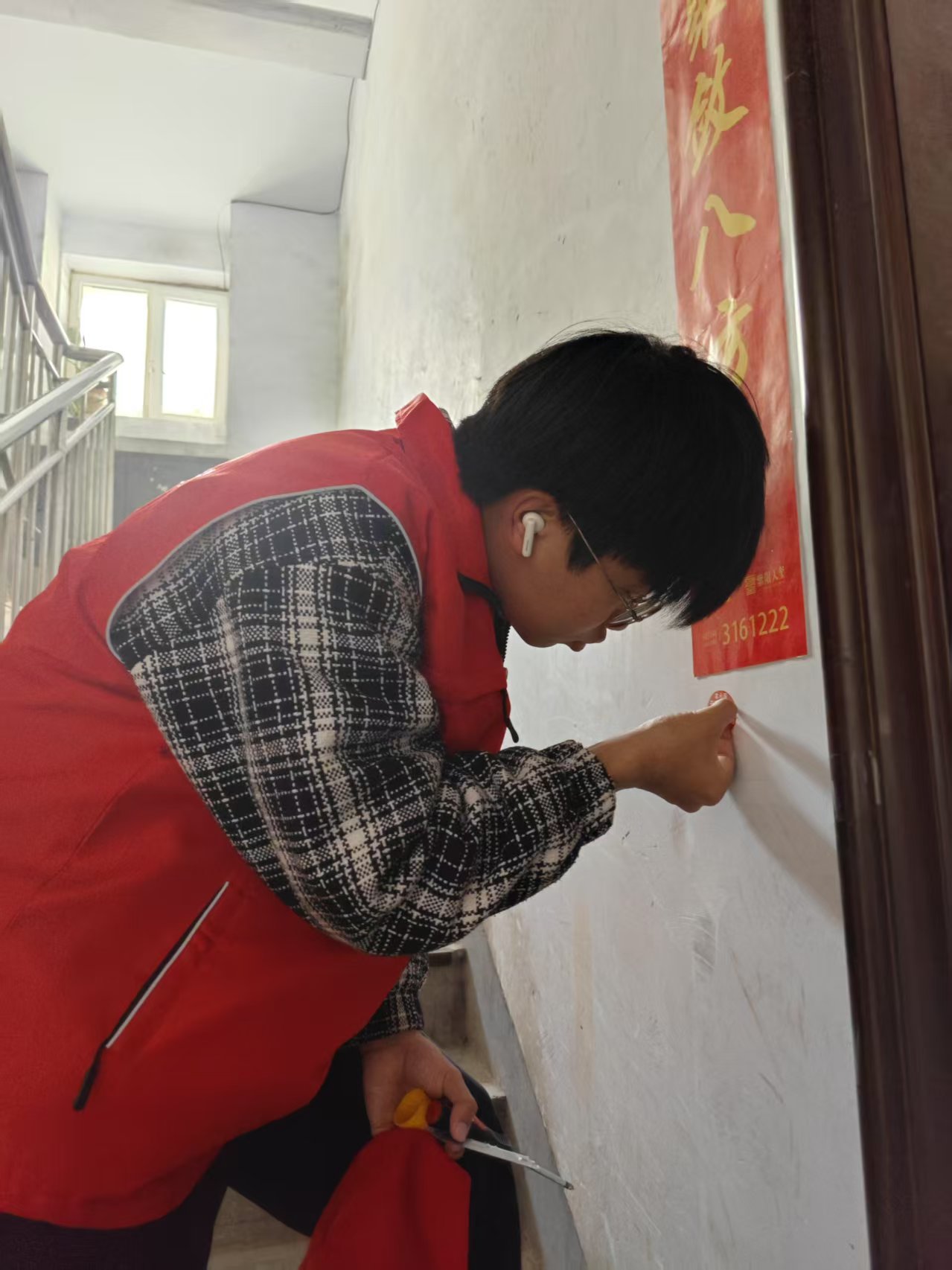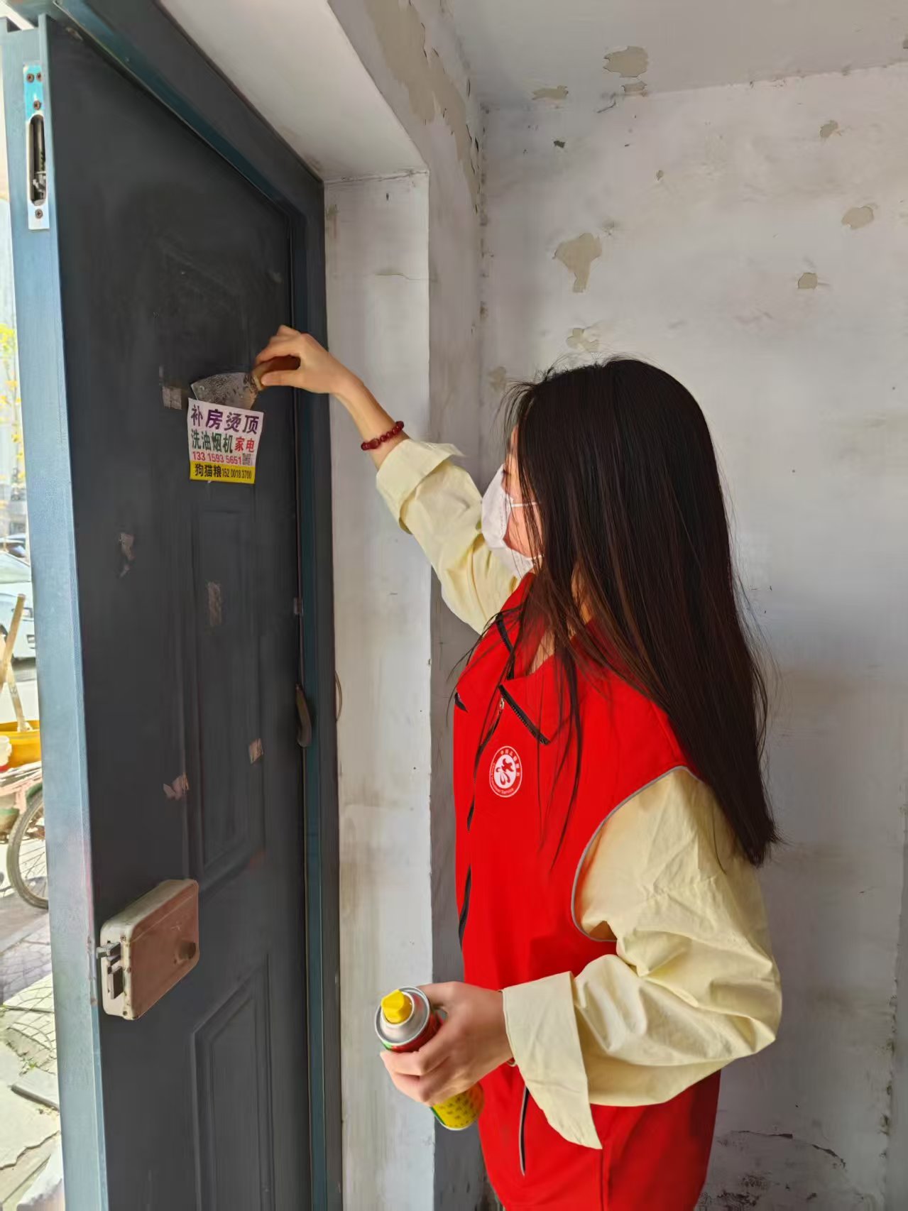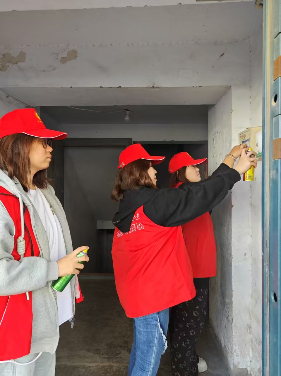 活动实施前,服装系衣心织梦志愿服务队的志愿者们进行分组分工并发放工具。根据任务特点,志愿者分设三个工作组:第一组使用铲子清除墙面非法小广告,第二组配备环保溶剂处理顽固污渍,第三组使用喷漆进行墙面补色维护。各组成员通过"发现-处理-修复"三级作业流程有序推进工作。