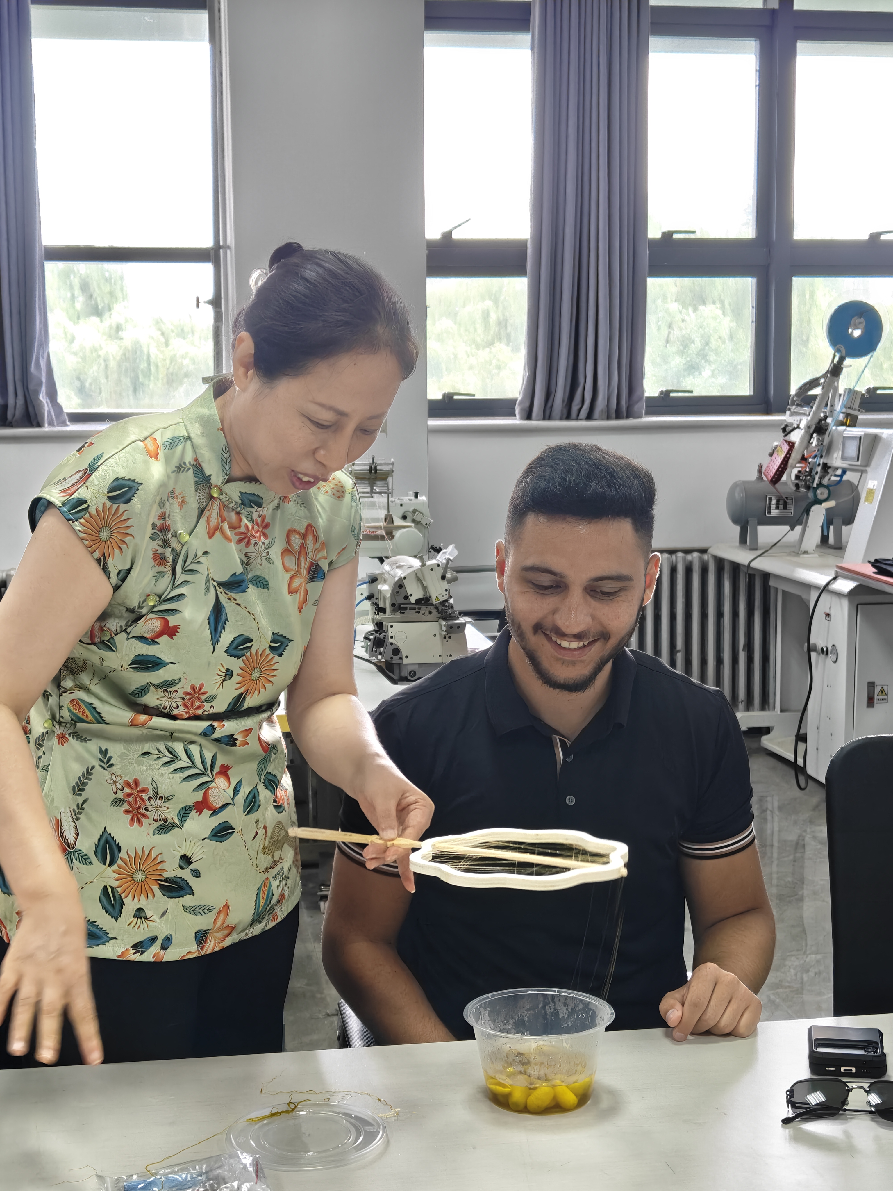 本次研学活动在服装工程系科创中心女红工作室举行。在工作室负责人王志红和张伟萌、侯雨霏两位助教老师的悉心指导下,代表团成员亲手参与并完成了蚕丝团扇的制作全过程。作为中国非物质文化遗产之一,蚕丝团扇以其细腻柔美的材质和精巧繁复的手工技艺而闻名。从搭扇骨、处理蚕蛹、煮丝、抽丝、绕丝编织,再到装饰扇面,每一个环节都凝聚着中国传统手工艺的智慧与匠心。