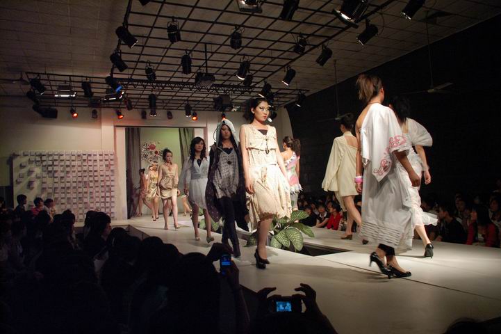 一段精彩的开幕词后,一场别开生面的服装展示表演就正式开始了,国际化的妆束,多元素的服装,新奇的人体彩绘,不时引起台下的掌声和欢呼。更令人称道的是服装材料:便利袋,筷子,纸张,塑料绞管,铁丝,窗纱,麻袋等等,我们生活中常见的东西,都运用到了服装上,同学们的想象力得到了极大地发挥。