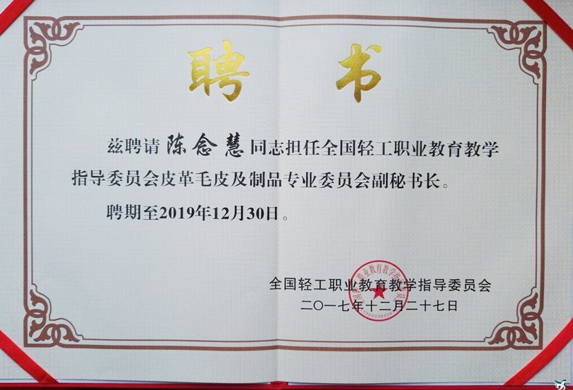 此外,我院陈念慧老师在本次会议上被主办方聘为全国轻工职业教育教学指导委员会皮革皮毛及制品专业指导委员会副秘书长和皮革行业技术技能教育专家。