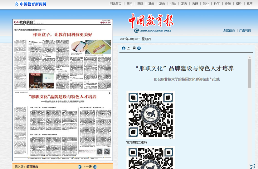 8月10日,中国教育报第四版刊登了《“邢职文化”品牌建设与特色人才培养》一文,宣传介绍了我院校园文化建设成果。