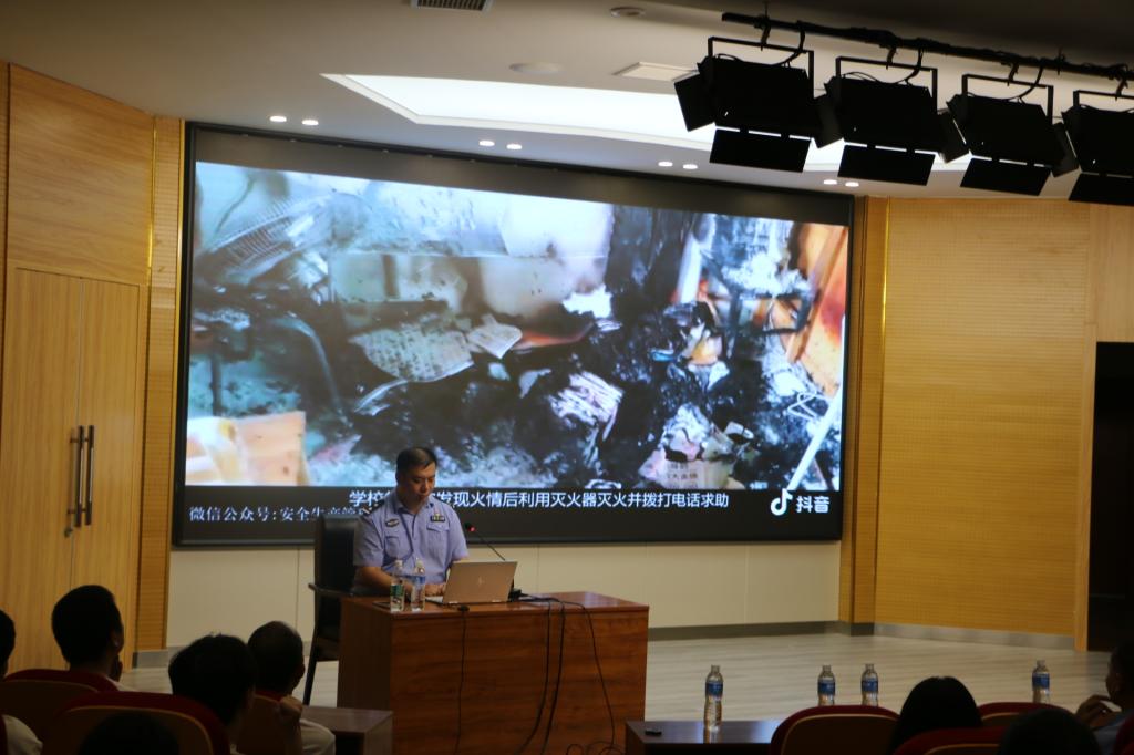 随后,杨警官结合近年来全国发生的典型火灾事故案例,以视频和图片的形式,生动地讲述了火灾的可怕与风险。杨警官运用大量残酷的案例让大家认识到了消防安全意识的重要性。杨警官还详细讲解了各种消防自救器材的用途、使用方法及注意事项,以避免在火灾发生时造成更大的危害。