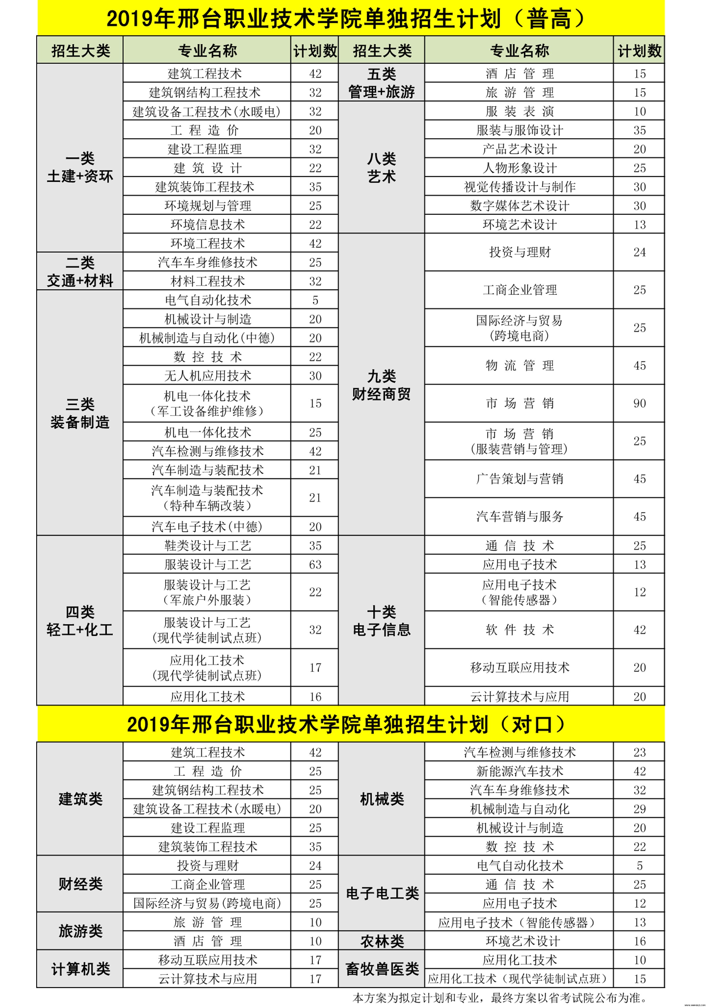 附: 邢台职业技术学院2019年单招招生计划2000人,分八大类54个专业。具体专业及计划如下: