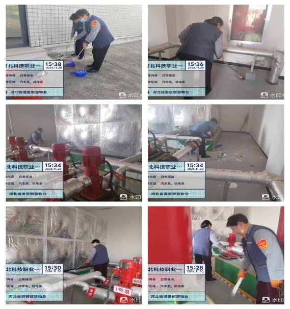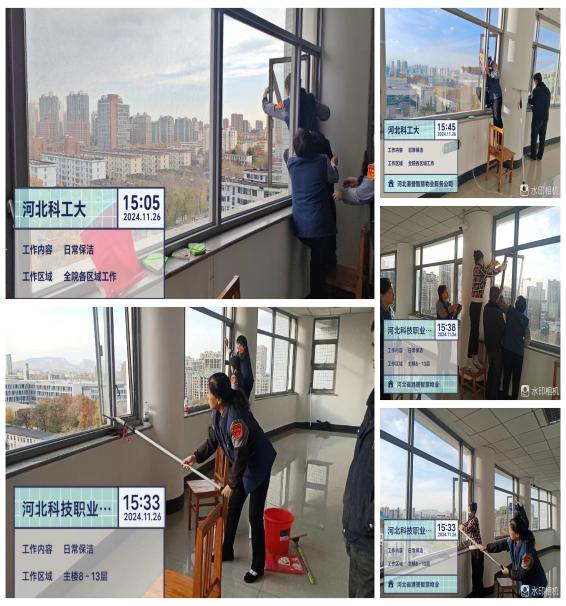 学生公寓物业重点对楼宇外墙、门头雨塔、厕所墙、便池墙面、水房门、水池、宿舍门、楼道、楼梯等角落卫生进行了全方位卫生清理,为同学们在校学习和生活提供了一个舒适的居住环境。