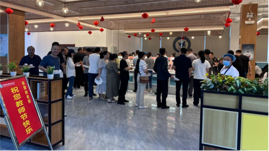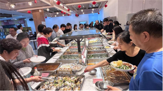 中午时分,陆续前来就餐的老师们带着节日的喜悦,放下工作中的严肃,品美味,相谈欢,在专属的节日里,享受这份难得的轻松与惬意。