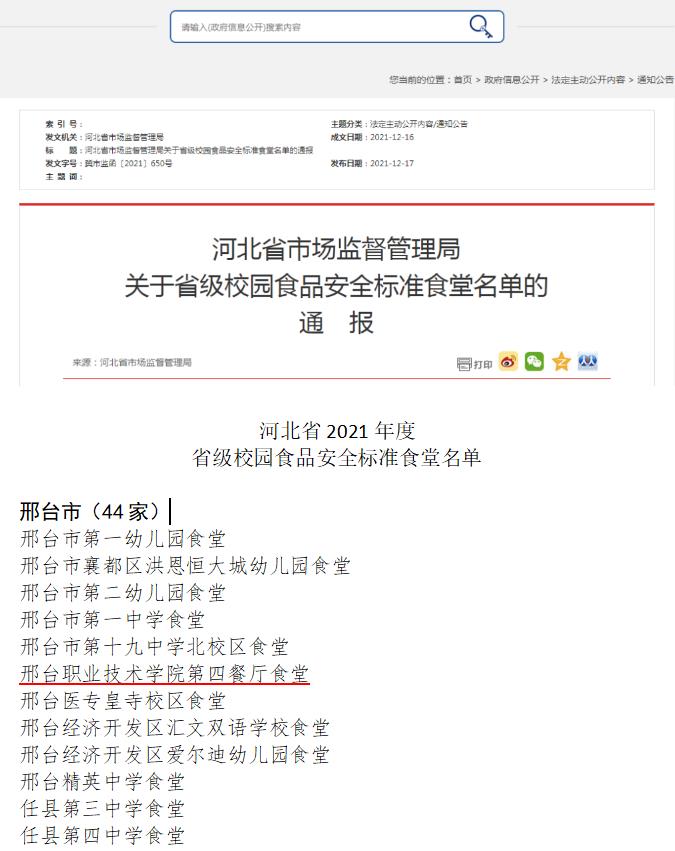 近日,河北省市场监督管理局公布了省级校园食品安全标准食堂名单,365官网西校区第四餐厅食堂凭借规范的管理体系、过硬的后厨设施条件、优越的就餐环境通过了评定,被授予“2021年度省级校园食品安全标准食堂”称号。