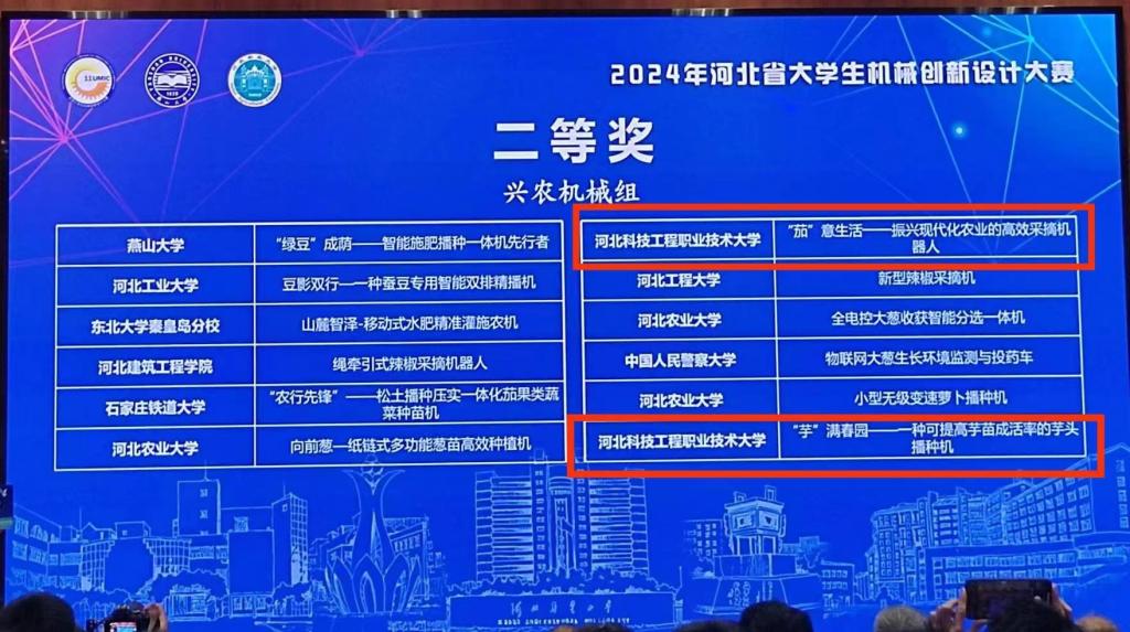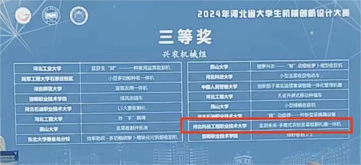 机电工程系师生积极备赛,最终由王瑞鑫,崔向航,张新旗,吴克品,靳宇浩同学组成的“播大精深-农田自动开沟播种施肥一体机”团队获得省赛一等奖,祁思雨、张德龙、王之航、赵济承、王阳同学组成的“茄意生活——振兴现代化农业的高效采摘机器人”团队获得省赛二等奖,张国樟、周陆毅、周月明、周扬、孟祥浩同学组成的“破茧——基于蝴蝶起飞特点的一种转角可调的柔性飞行器”和“芋满春园——一种可提高芋苗成活率的芋头播种机”团队获得省赛二等奖,和雪、李硕凯、马李硕、徐思淇、张赛鹏同学组成的“韭割未来-手推式韭菜收割扎捆一体机”团队取得了省赛三等奖的优异成绩。