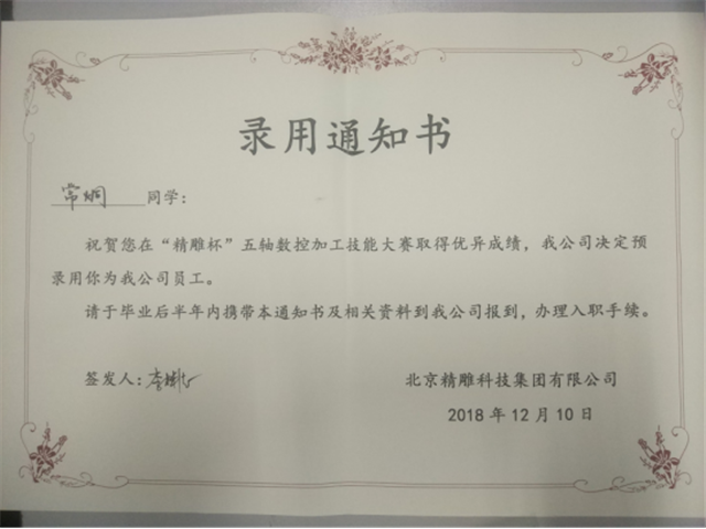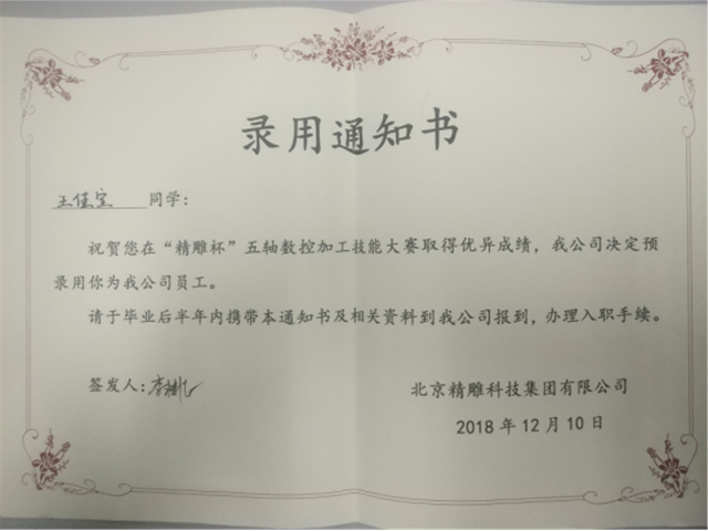 机电工程系技能大赛获奖学生被北京精雕集团录用