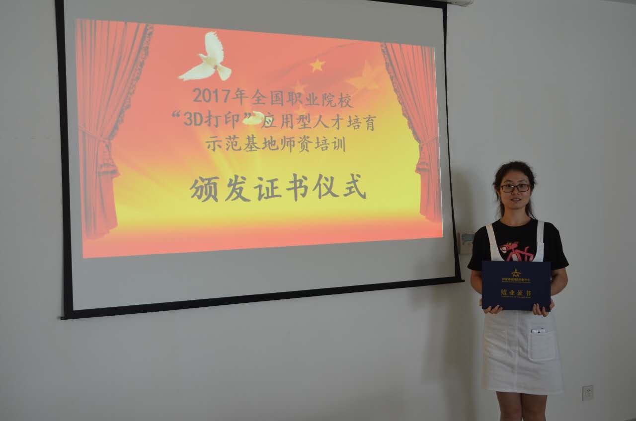 为期两周的培训主要从逆向工程简介、三维扫描机的使用、数据的获取处理及建模到3D打印以及模型的后期处理整个过程,除此之外还对各类打印机的使用、保养与维护以及注意事项学习了解,最后进行3D打印成型考试。通过培训,孙旋老师不仅学到知识,得到锻炼而且还获得了与其他院校老师进行交流的机会,促进了各院校之间的沟通。培训结束经考核合格后,孙旋老师获得了由教育部职业技术教育中心研究所颁发的培训结业证书和由快速制造国家工程研究中心颁发的中级证书。