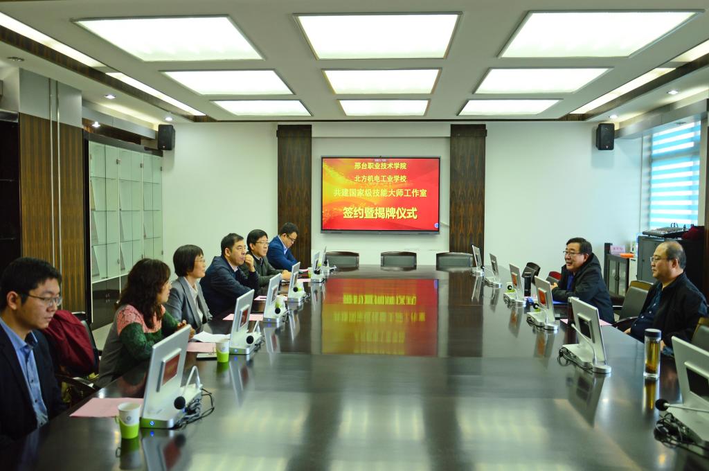 刘彩琴书记致辞,祝贺李明国家级技能大师工作室在我院顺利成立,希望在国家深入推进中高职衔接教育战略的背景下,三方加强合作交流,携手发展,实现强强联合。随后董雪峰书记对北方机电工业学校进行了全方面的介绍,也表示未来要加强与邢台职业技术学院之间的紧密合作,希望取得更好的成果。然后国家级技能大师李明对大师工作室的规划和研究内容进行了介绍,表示要以国家级技能大师工作室为平台,充分发挥工作室为社会、行业和企业服务的职能,实现项目驱动,实现各方共赢。紧接着李贤彬副院长、董雪峰书记与李明大师在现场共同为邢台职业技术学院“李明国家级技能大师工作室”揭牌并签署了合作协议。