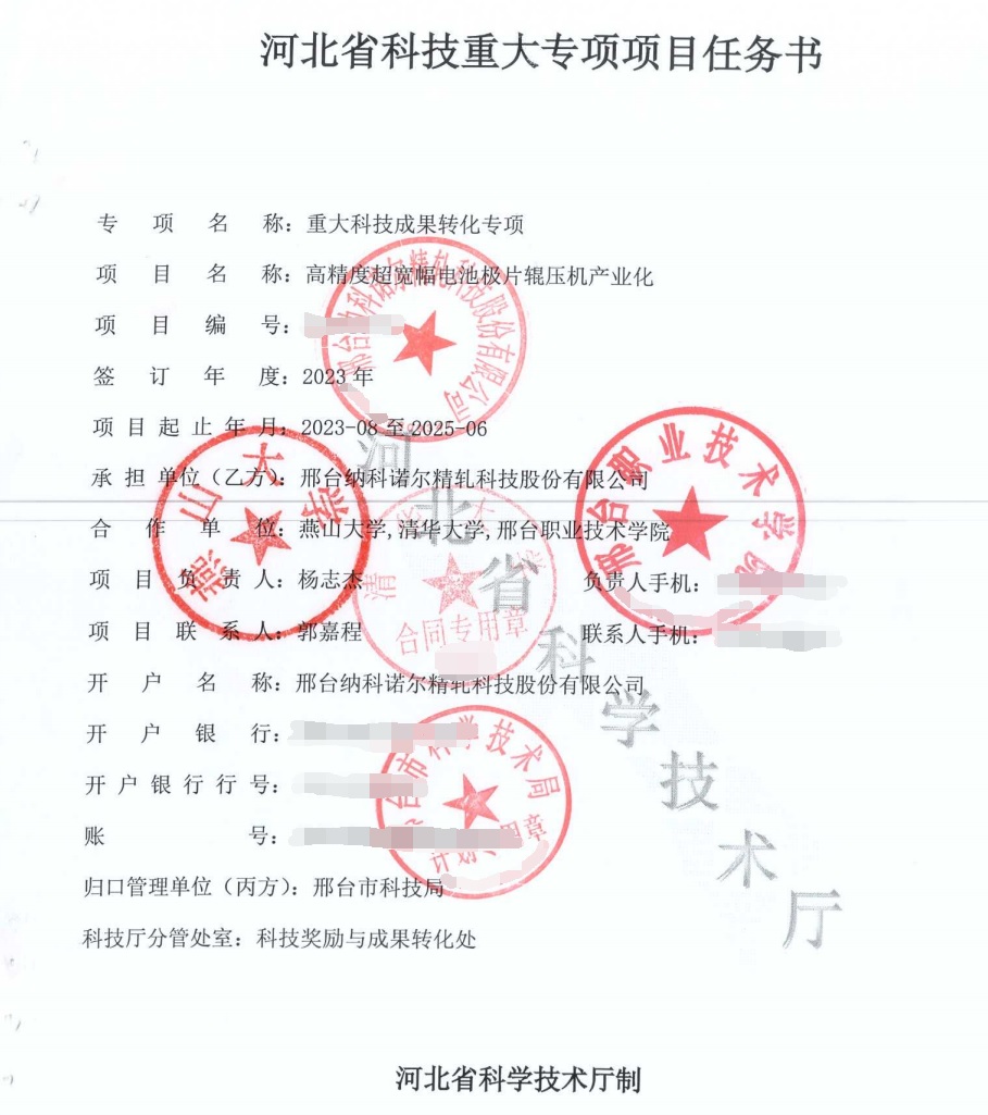 由365官网机电工程系王俊强博士带领的“新能源与先进装备技术研究团队”与邢台纳科诺尔精轧科技股份有限公司联合申报的2023年度中国式现代化河北场景重大科技成果转化项目《高精度超宽幅电池极片辊压机产业化》获批立项,获批经费400万。