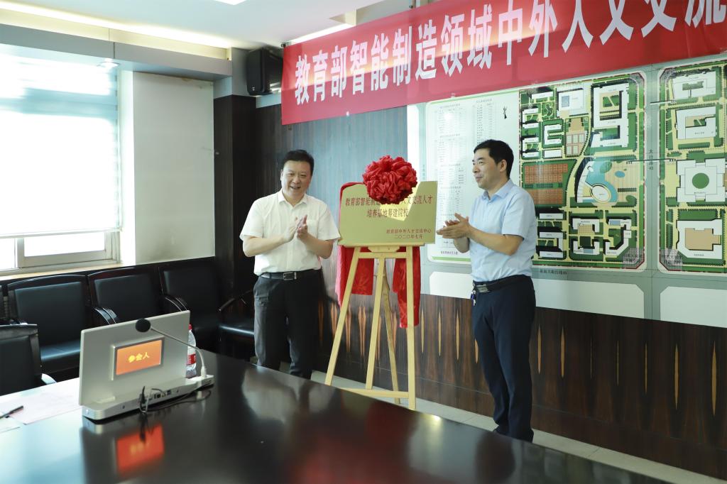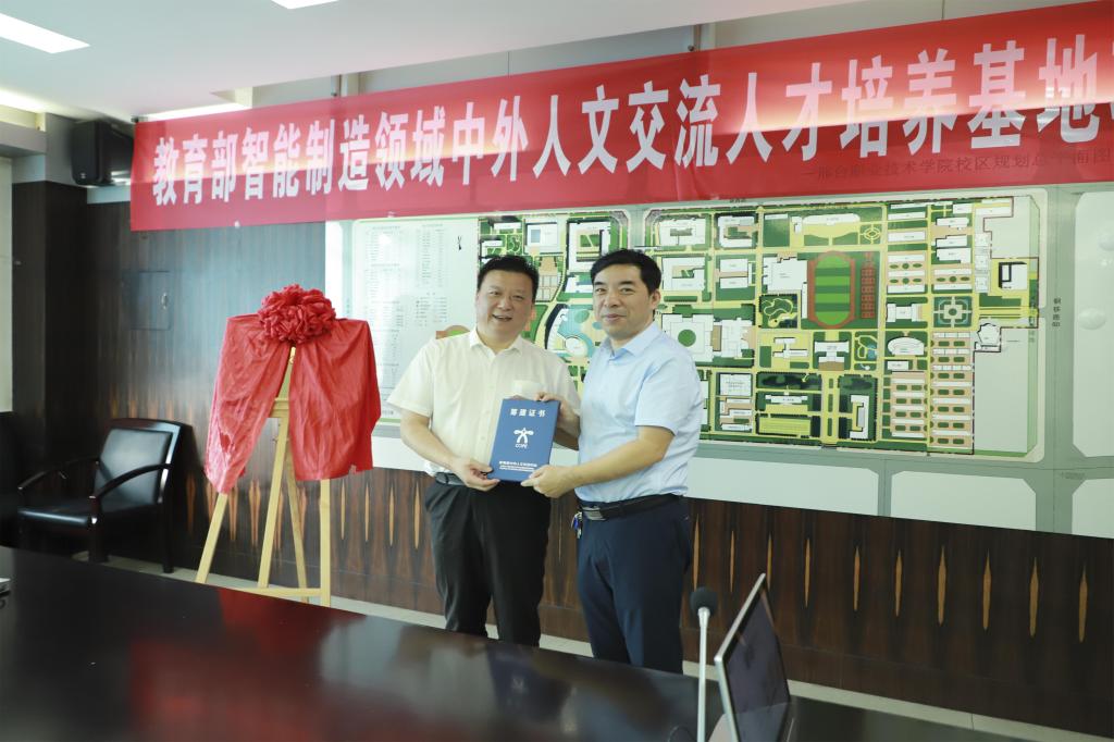 随后陈继权董事长向我院李贤彬副院长颁发由教育部中外人文交流中心发布的“2020年智能制造领域中外人文交流人才培养基地”筹建合作院校证书和项目启动揭牌仪式。