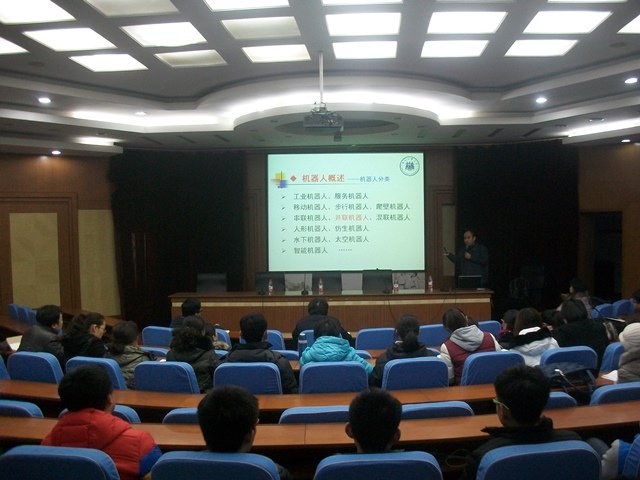 早8:30,讲座在机电系副主任高英敏的主持下开展。首先,张建军教授介绍了机器人的分类,同时列举出机器人技术所涉及到的相关学科;随后,张教授深入讲解了并联机器人的理论和技术方面的专业知识,通过对比串联与并联机器人的不同,使观众们了解到并联机器人在运动机构的重量、运动的精度等方面显著的优势,在设计并联机器人上,运用运动学建模与分析、精度和误差建模、轨迹规划与运动控制、并联机器人的标定等理论,以此优化机器人机构参数和运动性能,查找误差源以提高操作精度,充分发挥并联机器人的高速、高精度运动性能;关于并联机器人的应用张教授援引工业机器人、模拟器、多轴数控机床、主操作手等实例让观众们了解到并联机器人在各种领域的广泛应用,利用仿生学、力学等原理,使机器人更加贴近观众们的实际生活;接下来,张教授向观众们详细介绍自身的科研工作,先后引用结构解耦微操作并联机器人系统、基于集成设计方法的高性能晶片操作机器人、高速搬运并联机器人、并联结构3D打印机等研究成果,让同学们感受到机械领域的魅力,引起师生对机器人的浓厚兴趣;最后,张教授指出机器人未来的发展方向,德国的工业4.0和中国制造2025都显现出未来机器人对于国家发展的重要性,机器人向着智能化方向不断靠拢,与人共融的智能机器人、3C领域的高速轻载机器人和服务型机器人势必会将工业制造水平推向一个前所未有的高度。10:00讲座在热烈的掌声中圆满结束。