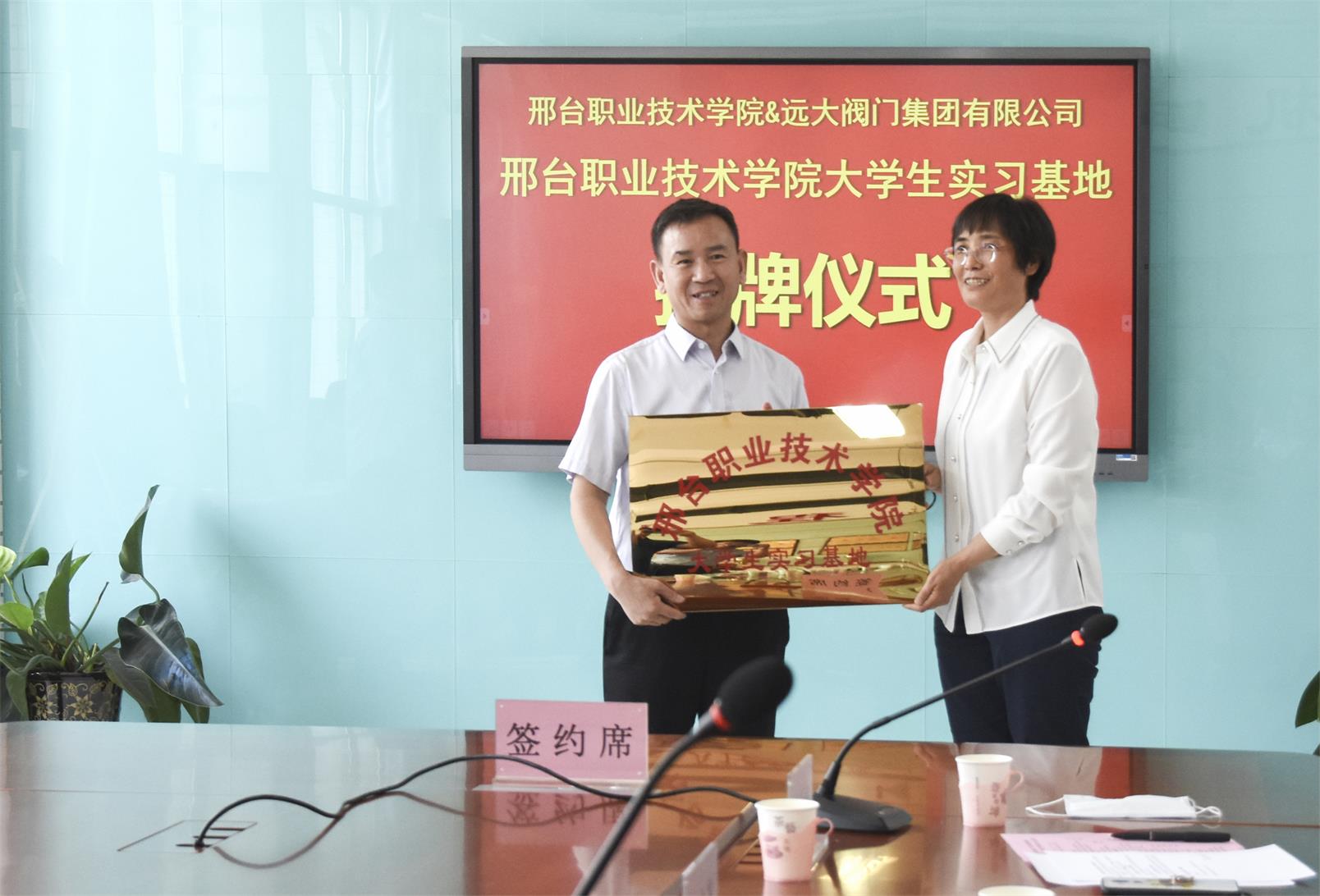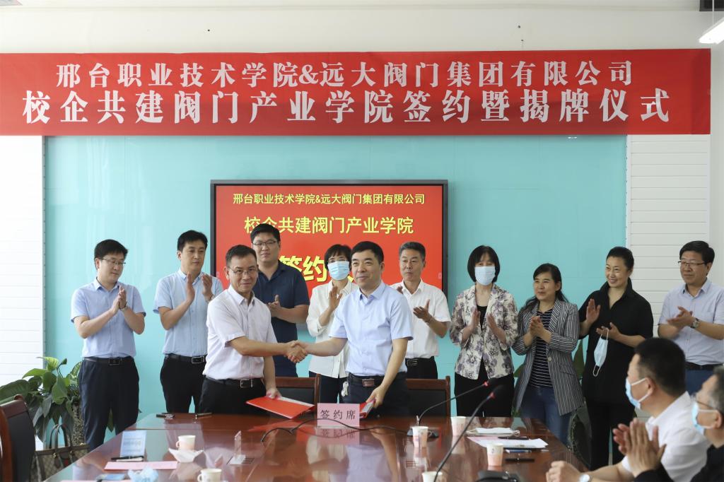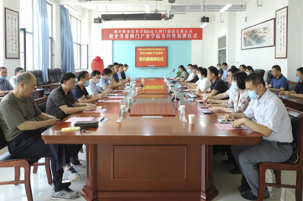 5月21日上午,我院与远大阀门集团有限公司共建的阀门产业学院在机电楼会议室召开了成立大会,会上举行了签约暨揭牌仪式,同时举行了远大阀门邢台职业技术学院大学生实习基地授牌仪式。参加会议的有邢台市教育局党组书记李建强、副局长杨彩霞,远大阀门集团有限公司总经理闫国安、铸铁分公司总经理于国峰、铸钢分公司总经理杜立波、人资总监秦淑琴,我院党委书记刘彩琴、副院长李贤彬、继教部主任冯旭敏、机电工程系书记马雪芳、主任高英敏等参加了大会。同时邢台市各大中专院校领导也莅临大会现场进行了产学研研讨。大会由高英敏主任主持。