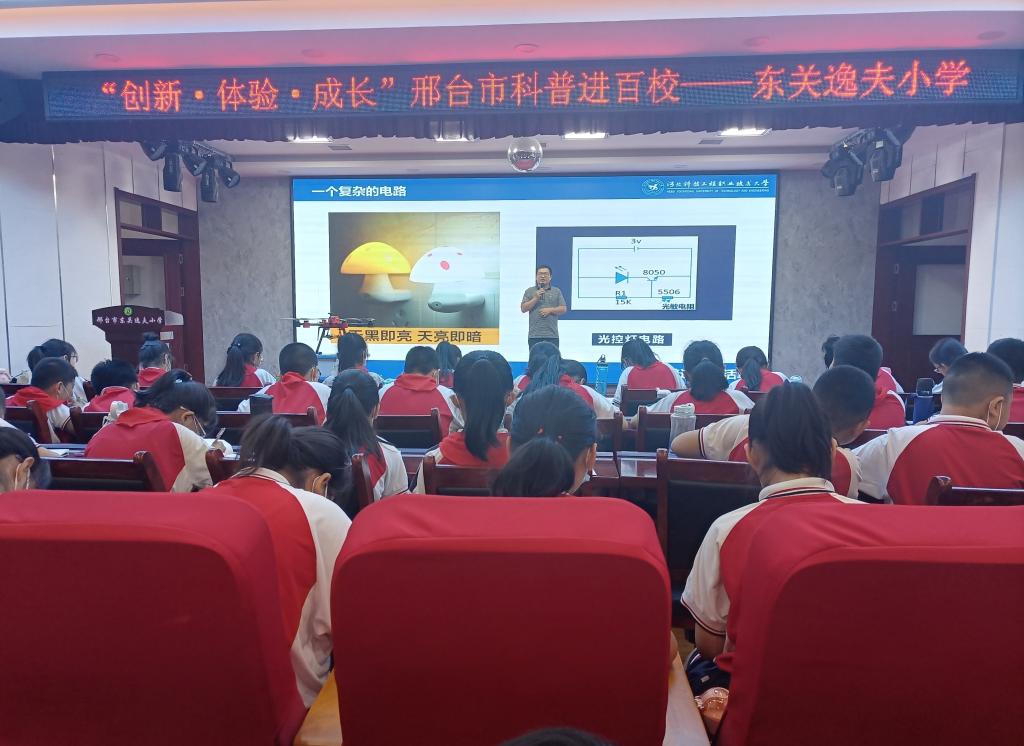 为更好地引领广大青少年提高科技创新能力与科学素质,推动学校科普活动的开展,邢台市科协、教育局和团市委联合组织在全市范围内开展市级首席科技辅导员科普进百校大型公益活动。应邢台市东关逸夫小学邀请,我系王俊强、赵勇、张业宏三位教师于6月7日对该校四年级学生开展科普教育活动。