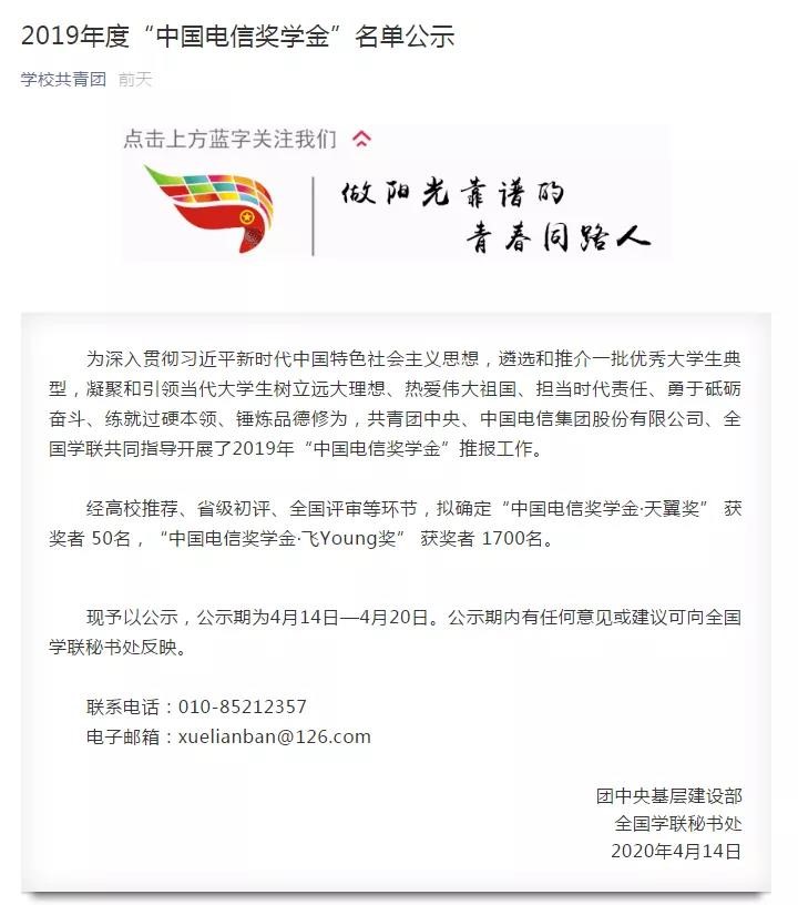 近日,由共青团中央、全国学联、中国电信集团股份有限公司共同主办的2019年度“中国电信奖学金”遴选寻访活动结果揭晓。机电工程系2017级机电1703班刘富传同学荣获2019年度“中国电信奖学金·飞Young奖”荣誉称号。