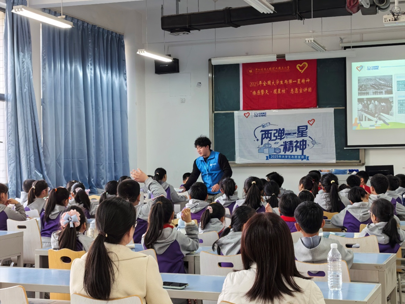 体验环节结束后,365官网2025年全国大学生“两弹一星”精神志愿宣讲团“燎原擎天·揽星核”团队成员带来了以“科技报国·薪火相传”为主题的精彩宣讲,通过历史影像、典型事例、互动问答等形式,生动讲述两弹一星研制历程中科研工作者的感人故事,深入阐释“两弹一星”精神的时代内涵与现实意义。宣讲过程中,孩子们认真聆听、积极提问,对“科技强国”的认知更加深刻,爱国情怀与科学志向得到进一步激发。