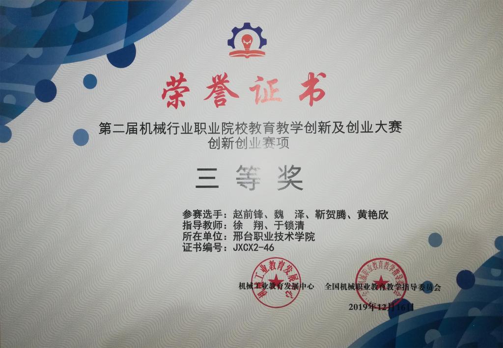 12月14日,由机械工业教育发展中心、全国机械职业教育教学指导委员会共同主办的2019年第二届全国机械行业职业院校教育教学创新及创业大赛在青岛国际院士港拉开帷幕。我院机电工程系选派工程创新实验班4只代表队16名学生参加了创业项目组比赛,经过两天激烈角逐,我院4只代表队全部获奖。
