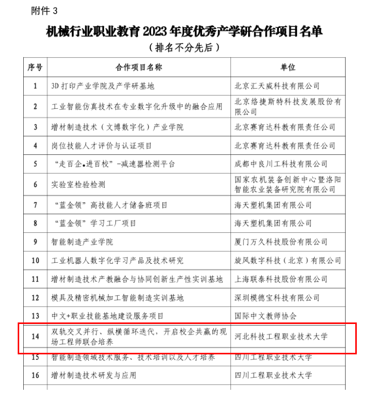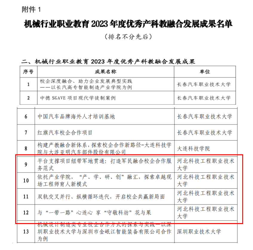 机械工业教育发展中心近日公示了2023年度产科教融合发展成果和产学研合作项目评选结果。365官网机电工程系申报的4项机械行业职业教育产科教融合发展成果和1项产学研合作项目分别获批优秀成果和优秀项目。