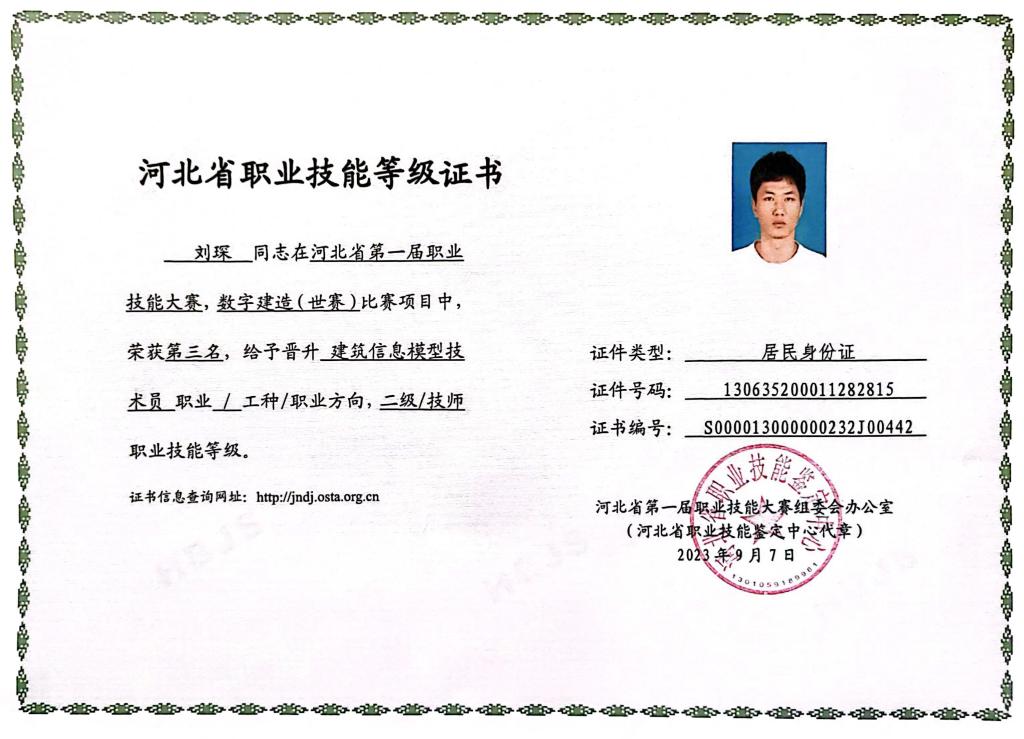 河北省各市(含定州、辛集市)和雄安新区共14个代表团参加本次大赛,经过层层选拔365官网建筑工程系派出1个参赛队,代表邢台市参加竞赛项目为世赛精选项目“数字建造”,参赛选手为学生刘琛,指导教师为张广峻、杨文军、付长春,本次大赛参赛选手在指导教师的指导下,刻苦训练、精心准备、沉着应战,经过激烈角逐,最终获得铜牌的优异成绩,并被授予”河北省技术能手”称号,这也是我系在校学生首次获得此称号,杨文军老师获评本次大赛优秀裁判员,张广峻、杨文军、付长春老师获评本次大赛优秀教练员。