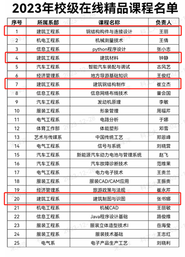 为践行线上线下混合式教学改革,加强优质教学资源的开发和共享,进一步提高人才培养质量及职业教育影响力,在学校开展的2023年度校级在线精品课程的评选中,我系王丽、钟静、崔立杰、张书娜四位老师的《钢结构构件与连接设计》、《建筑材料》、《建筑钢结构制作》、《建筑制图与识图》课程被认定为“校级在线精品课”。