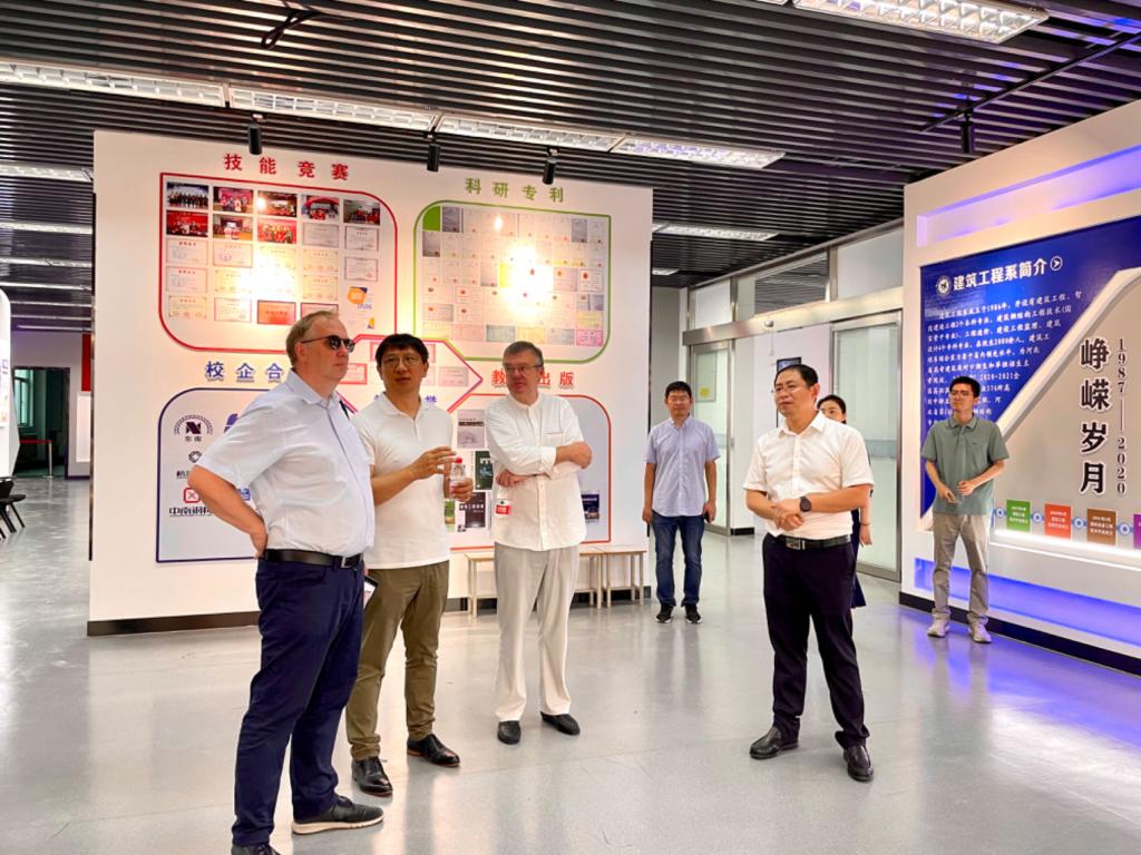 7月26日,德国萨克森双元制应用技术大学校长汉塞尔教授、副校长施韦泽教授一行到我系交流参观。在副校长李贤彬、建筑工程系主任张广峻、副主任崔立杰与实训中心教师们的陪同下,与德方一行参观了建筑工程技术中心。