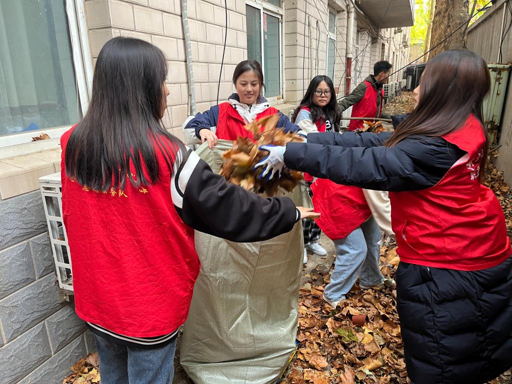 下午1:00,志愿者们身穿红马甲到达养老院。大家首先在负责人组织下领取劳动工具,对养老院的落叶进行清理,让院内环境变得更加干净整洁。随后,在工作人员带领下,志愿者们参观老人的居住环境,了解老人的日常生活情况。待老人们午休结束后,志愿者们与老人进行互动和联欢。一方面,结合现实案例为老人们科普防诈骗知识,增强老年人法治意识和防诈骗能力;另一方面,为老人表演歌曲串烧和手势舞《桃花朵朵开》等节目,带去欢乐。最后,志愿者们还同老人一起合唱《草原上升起不落的太阳》、《毛主席的话儿记心上》等红色经典歌曲,整个养老院里萦绕着爱的暖流,场面温馨感人,老人们脸上洋溢着幸福的笑容。