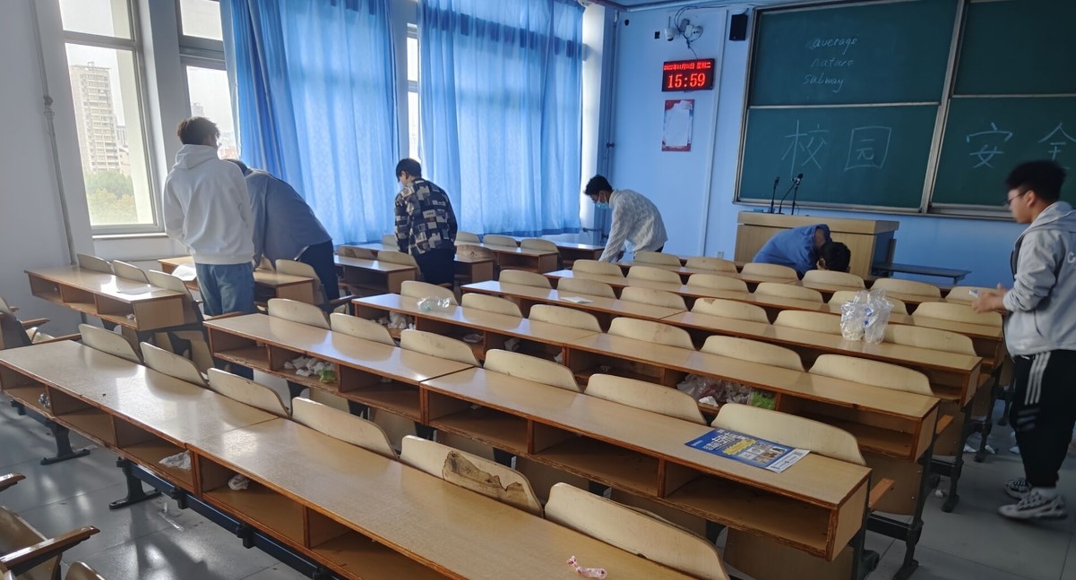建工本2203、2204班的全体学生,分为六个组对主教8.9节无教学安排的教室进行了清扫,同学们分工明确,擦桌子、扫地、拖地、擦黑板,干劲十足。