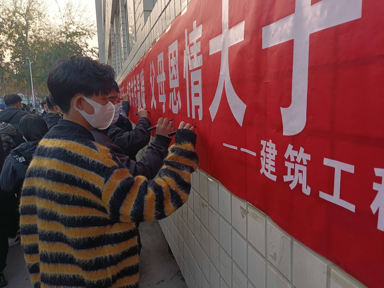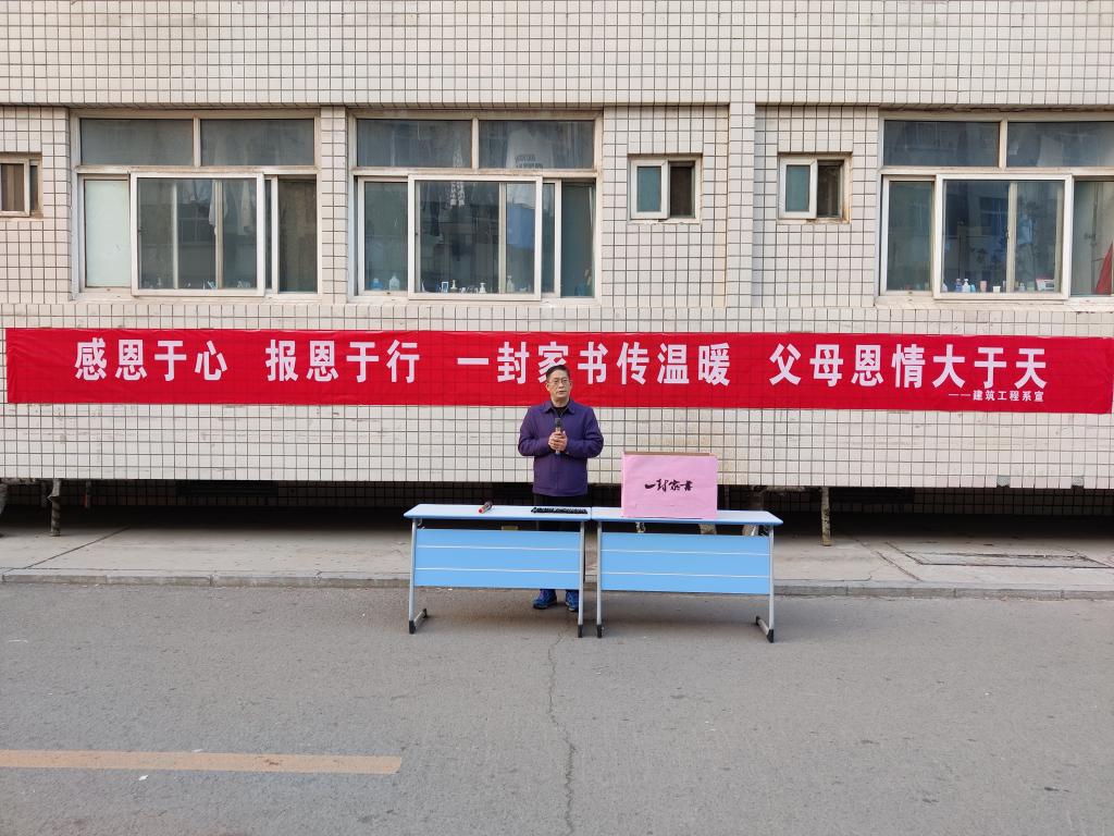 活动现场,建筑工程系党总支刘志忠书记发表讲话。刘书记强调百善孝为先,同学们要感恩父母的养育之恩,弘扬孝道,也要感恩老师的培养和同学的友爱之情,积极弘扬中华优秀传统文化。要将感恩之心化为实际行动,不断充实自己,做好未来规划;树立目标,努力奋斗。随后,同学们将满怀深情写下的家书依次投递到信箱中,在“感恩于心,报恩以行,一封家书传递温暖,父母恩情大于天”的横幅上签上自己的名字。