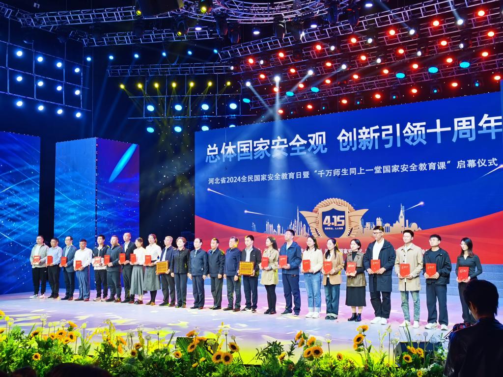 4月15日,河北省2024全民国家安全教育日暨“千万师生同上一堂国家安全教育课”启幕仪式在河北传媒学院举行,于小五受邀参加启幕仪式,并接受河北省教育厅、国家安全厅领导颁奖。(左二为于小五)。