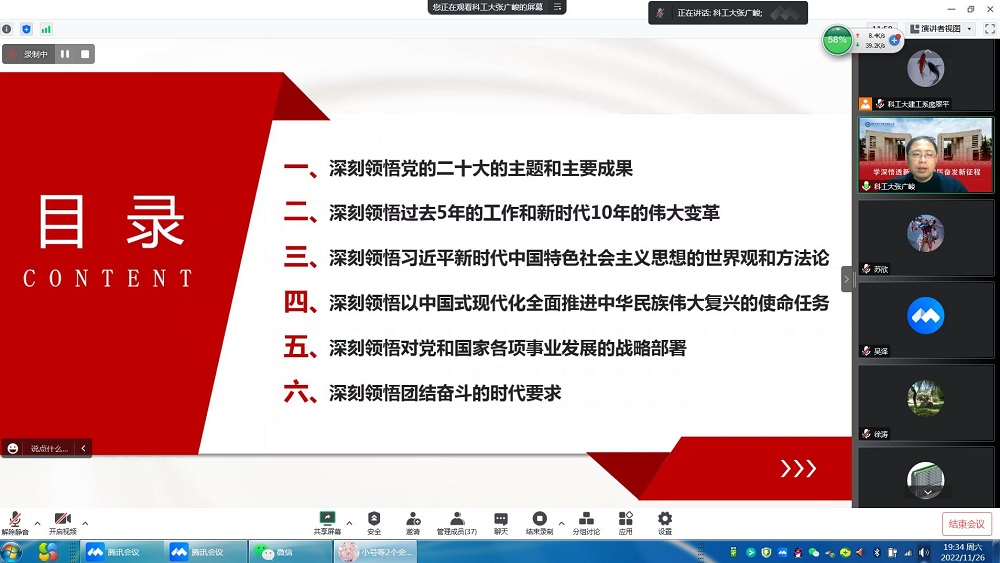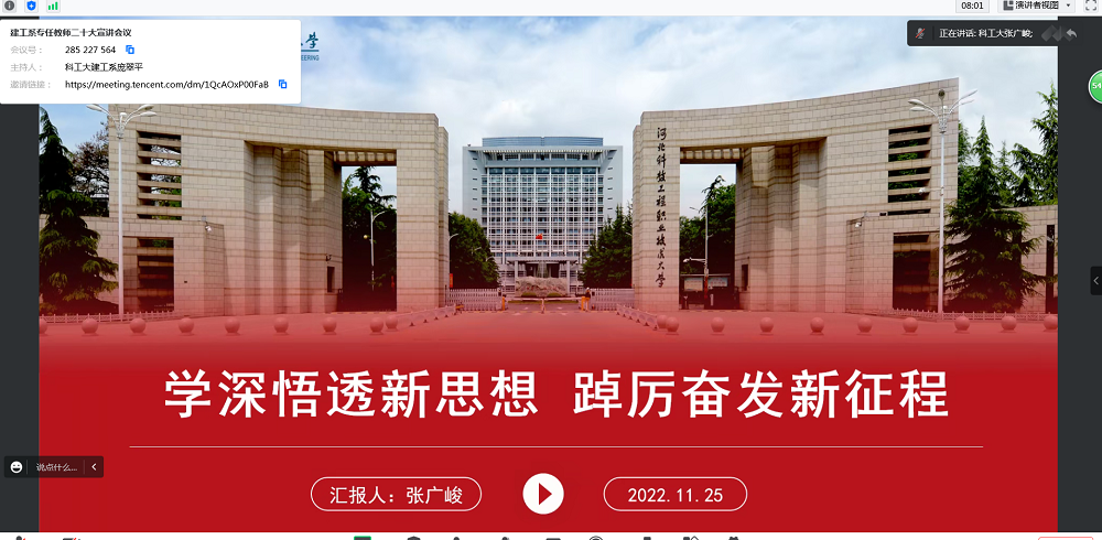 为深入学习宣传贯彻党的二十大精神,11月26日晚,建筑工程系副主任张广峻组织我系全体专任教师在线上开展以“学深悟透新思想,踔厉奋发新征程”为主题的党组织生活会。