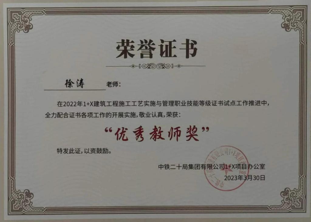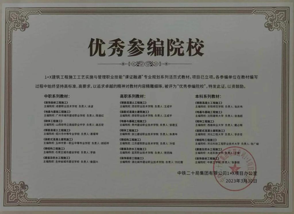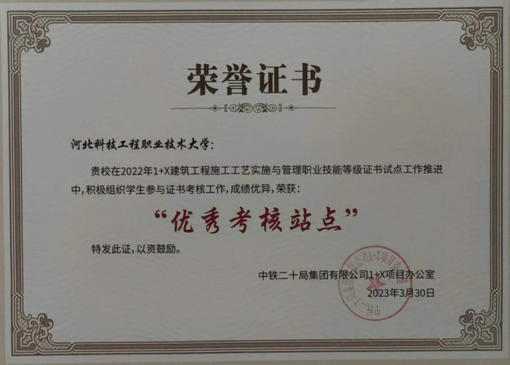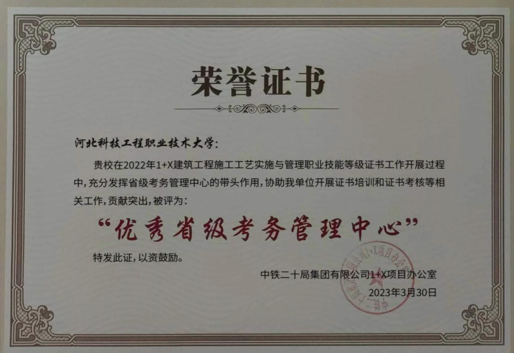 2022年,365官网在“1+X”建筑工程施工工艺实施与管理职业技能等级证书考试工作中,成绩突出,得到中铁二十局集团“1+X”项目办的肯定,365官网中级、高级职业技能等级证书考核过关率双双获得100%,365官网共获得优秀省级考务管理中心、优秀考核站点、配套教材优秀参编单位和优秀教师四项荣誉证书。