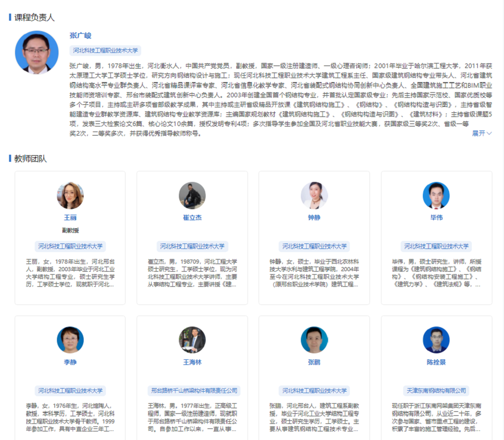 《建筑钢结构施工》课程为河北省建筑钢结构工程技术专业教学资源库、智能建造专业群教学资源库核心课程。2021年获得河北省精品在线开放课程评选一等奖、河北省信息化教学作品比赛一等奖。