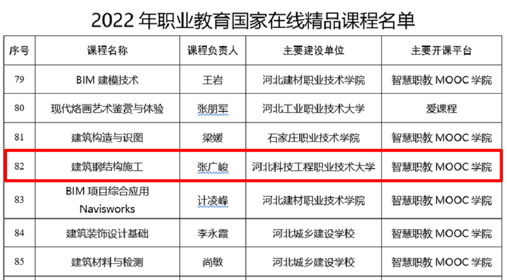 近日,教育部办公厅公布了《2022年职业教育国家在线精品课程名单》,我系张广峻副教授主持的《建筑钢结构施工》获批国家级在线精品课程,实现了我系课程建设国家级成果零的突破。