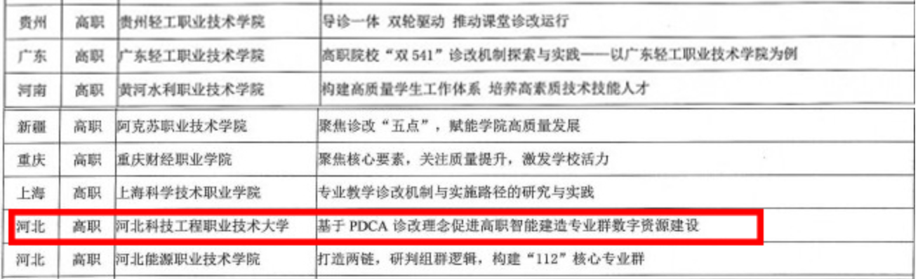 日前,教育部中国教科院职业与继续教育研究所发布《2022年职业院校教学诊断与改进典型案例名单》与《〈2022年职业院校教学诊断与改进典型案例集〉入编名单》。学校共有3项诊改案例入选,1项诊改案例入编,其中我系张广峻主任主持诊改案例《基于PDCA诊改理念促进高职智能建造专业群数字资源建设》入选。