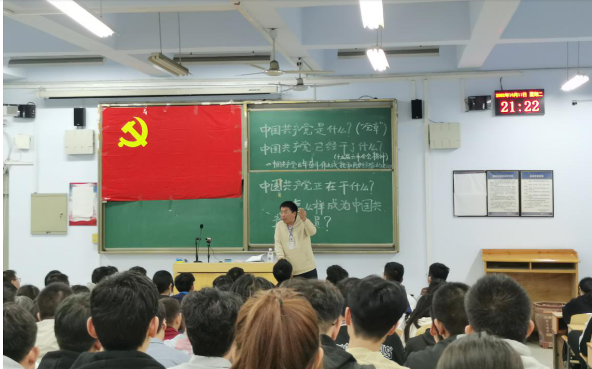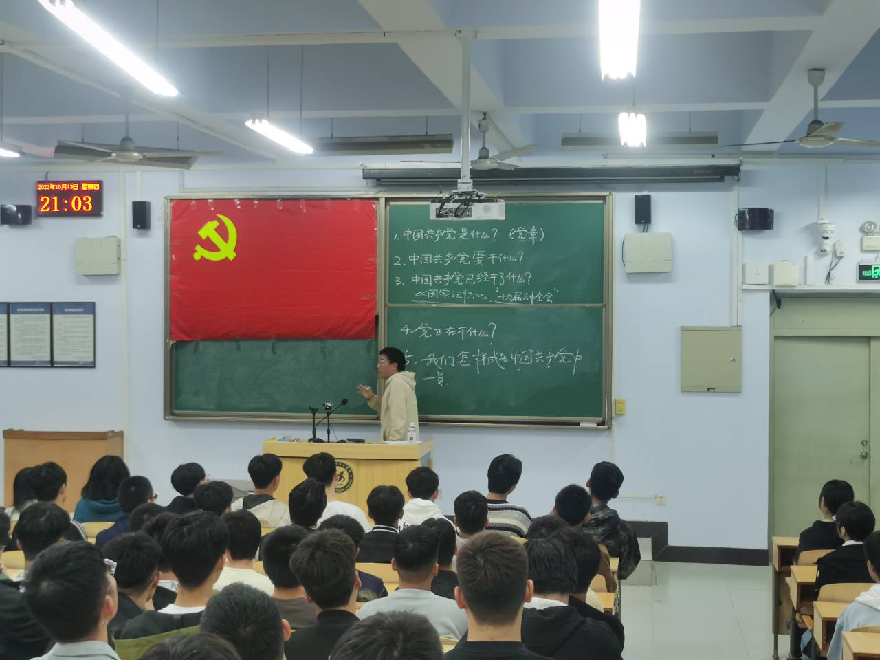 10月11日晚7:30,在主教1-2,于小五老师以“党章”、党中央重要会议精神和习近平总书记重要讲话精神为根本遵循,以党的百年奋斗伟大成就和历史经验,特别是新时代十年党和国家事业所取得的历史性成就、发生的历史性变革为实践依据,给同学们激情阐释了“党是什么?”“党要干什么?”“党已经干了什么?”“党正在干什么”。围绕建筑工程系学生党支部情况、入党申请书撰写、从申请入党到入党需经历的历练和组织流程给同学们详细解释了“怎样光荣地成为中国共产党中的一员”。