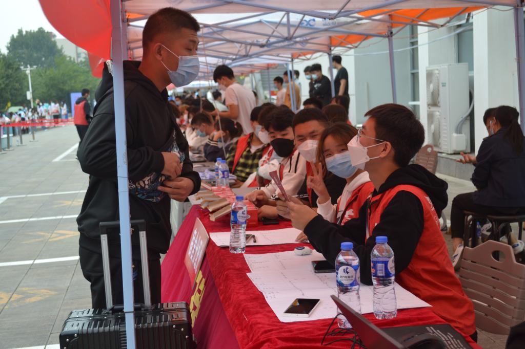 我系新生接待处设在体育馆北侧,红色的迎新条幅,人性化的道路指示,面带微笑的志愿者,彰显了建筑工程系良好的精神面貌。志愿者们的服务精神展现在每个细节之中:带领新同学办理入学手续、搬运行李、领取被褥……哪怕天空下起绵绵细雨,他们的热情依旧未减,主动提供雨具护送新生,既暖心又高效。期间,我系领导和老师还深入宿舍,为新同学们送上嘱托和关怀。