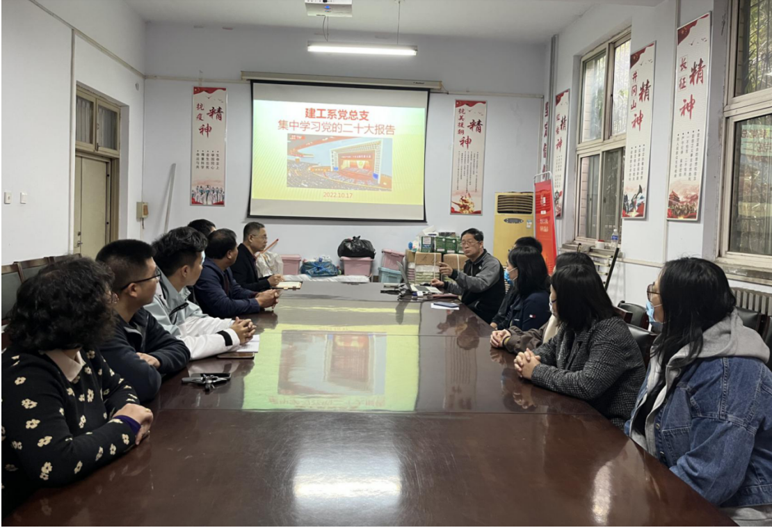 10月17日上午10:00,建筑工程系组织部分进校教工党员在建筑工程系会议室集中学习党的二十大精神。在集中学习时,刘志忠书记指出,党的二十大报告,是一份全面阐述过去5年工作和新时代10年伟大变革求真务实的报告;是一份闪耀着马克思主义真理光芒、具有深刻历史洞察力、重要理论引领力、强大实践指导力的报告;是一份全面擘画未来、描绘中华民族伟大复兴光辉前景的报告,必将鼓舞和动员全党全国各族人民在以习近平同志为核心的党中央坚强领导下,踔厉奋发、勇毅前行,奋力谱写全面建设社会主义现代化国家崭新篇章。学习贯彻党的二十大精神,是今后一个时期建筑工程系一项重大政治任务。今天只是我们学习二十大报告“开学第一课”,我们会组织全系师生开展系列学习活动。刘志忠书记强调,学习二十大报告要坚持读原文、悟原理,系统全面学、联系实际学、对照问题学、带着感情学、深入思考学、融会贯通学。从党的二十大报告的精神要义中深刻领会高举中国特色社会主义伟大旗帜,全面贯彻习近平新时代中国特色社会主义思想,弘扬伟大建党精神的极端重要性,深刻理解“两个确立”的决定性意义,不断增强“四个意识”,坚定“四个自信”,做到“两个维护”;从党和国家“过去五年的工作和新时代十年的伟大变革”的学习和切身感受中汲取踔厉奋发、勇毅前行的力量;从对“实施科教兴国战略,强化现代化建设人才支撑”的战略部署的学习中坚定我们“为党育人、为国育才”的定力;从对“推进文化自信自强,铸就社会主义文化新辉煌”的深刻领悟中坚定我们的文化自信,进一步巩固马克思主义在意识形态领域指导地位,坚守中华文化立场,讲好中国故事、传播好中国声音,展现可信、可爱、可敬的中国形象......刘志忠书记最后强调,我们广大教工党员,要充分利用“课程思政”“三全”协同育人效应和“党员包班”平台育人功能,深入开展党的二十大精神进课堂、进头脑活动,让党的二十大精神深入人心,见诸行动。