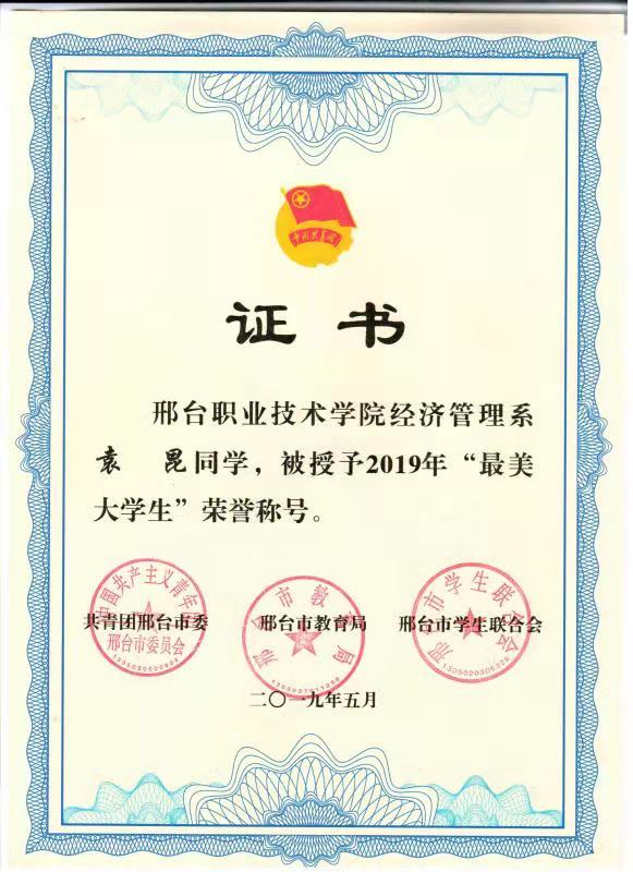 近日,由团市委、市教育局、市学联秘书处共同举办的2019年邢台市“最美中学(中职)生”、“最美大学生”评选活动,经过寻访申报、材料初审、网络投票和综合评审,我系袁昆同学荣获2019年邢台市“最美大学生”荣誉称号。