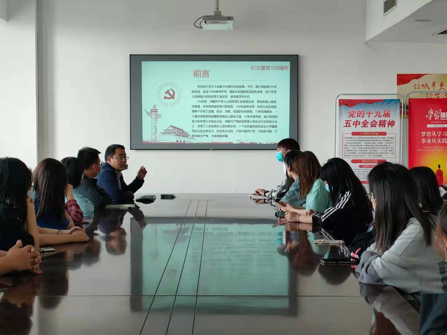 5月5日下午5:00,经济管理系在系会议室举办党史学习教育会,系主任孔维功担任主讲人,20级电商专业学生参加学习。