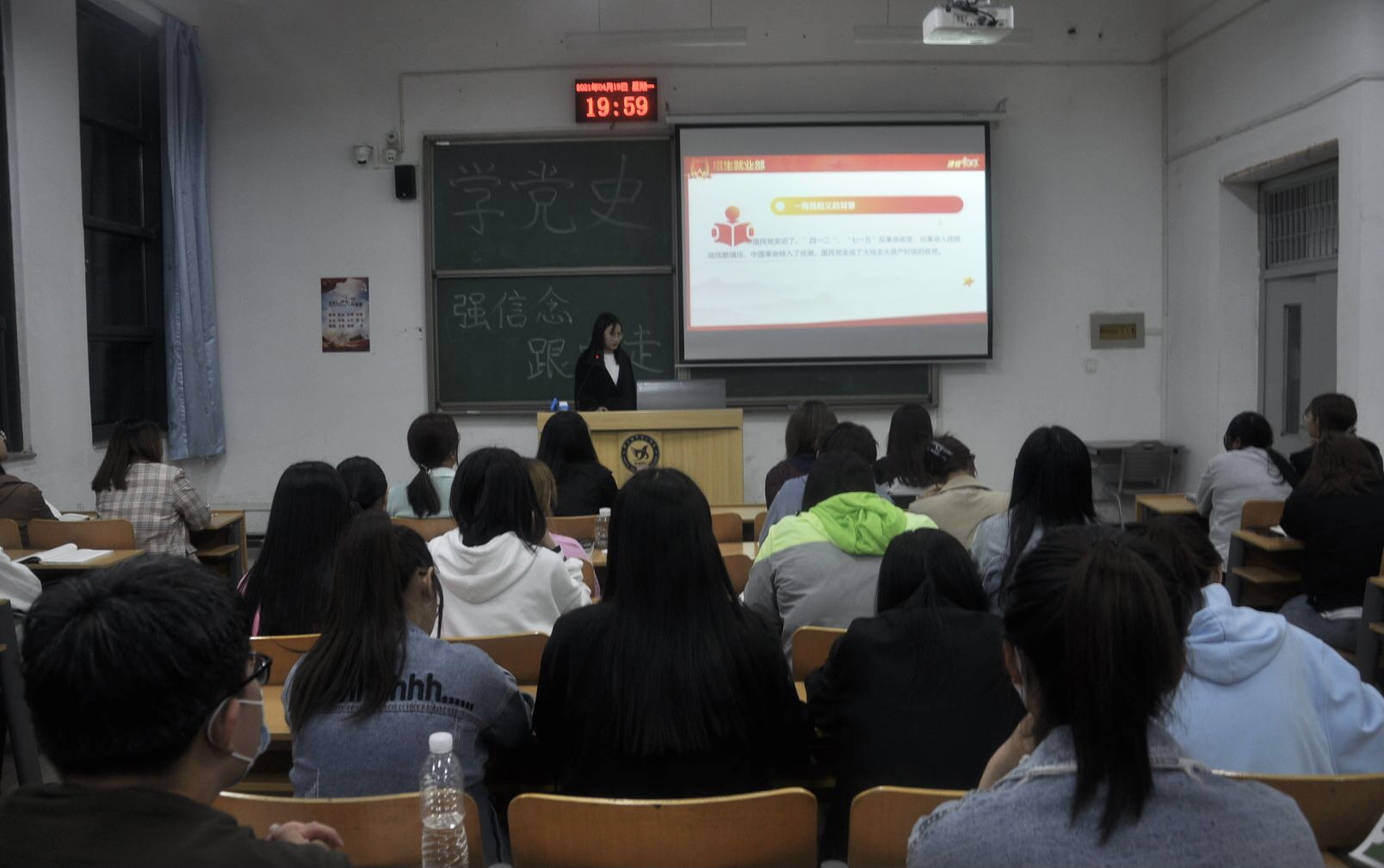 为了弘扬中国共产党立党为公,执政为民的精神,增强学生对党的认同感和归属感,传承优秀红色基因。我系招生就业部于4月18日晚八点在C区101教室举办了“学党史,强信念,跟党走”系列宣讲活动。出席本次活动的有经管系学生会团总支招生就业部全体成员以及营销一、二班全体同学。