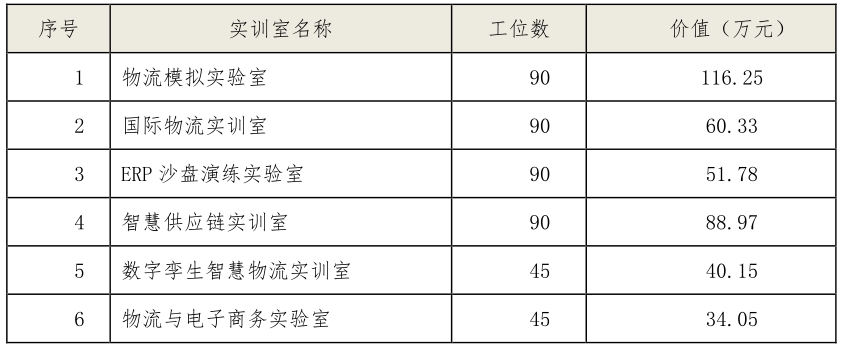 基于国家级高技能人才培养基地和河北省邮政行业人才培养基地的建设,物流管理专业累计投入600多万元建设了总面积3000平方米的实训中心,配备了完善的硬件设备与专业的软件平台,生均教学科研仪器设备值超过1.86万元。实验室可满足多门专业课的实验教学需要求,以及多门基础课的实验要求。实验开出率达 100%,足以满足物流管理本科专业的各门课程的实验教学任务要求。